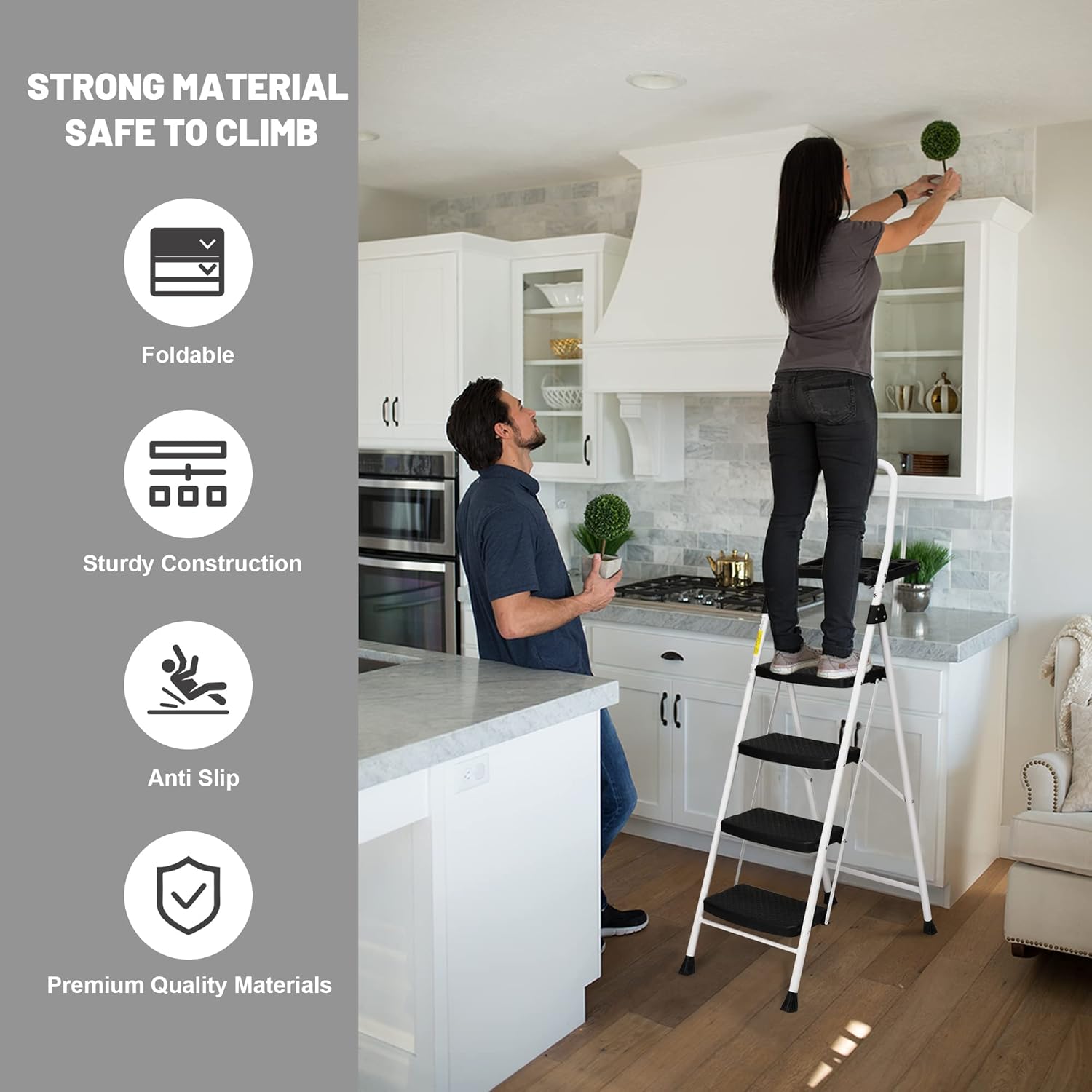 • Multifunktionale Verwendung: Die Trittleiter kann in verschiedenen Szenarien wie Schlafzimmern, Garagen, Büros. Einzelhandelsgeschäften, Bibliotheken usw. verwendet werden. Gleichzeitig kann die 4-stufige Leiter Ihren unterschiedlichen Anforderungen