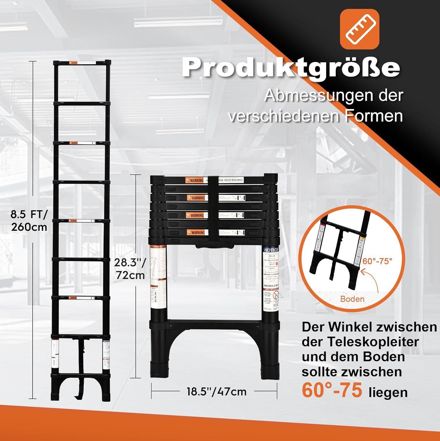 • Produktabmessungen: Die Verpackungsgrösse beträgt 75*47*8 cm.Die Leiter kann bis zu 2,6 Meter ausgezogen werden und trägt ein Gewicht von bis zu 330 Pfund