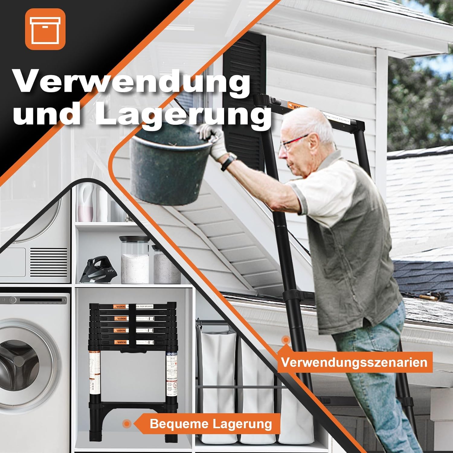 • Vielseitige Nutzung: Ob beim Wechseln von Glühbirnen im Innenbereich, beim Zugang zum Dachboden, bei der Reparatur von Dächern im Aussenbereich oder beim Besteigen eines Wohnmobils – unsere teleskopische Aluminiumlegierungsleiter ist für jede