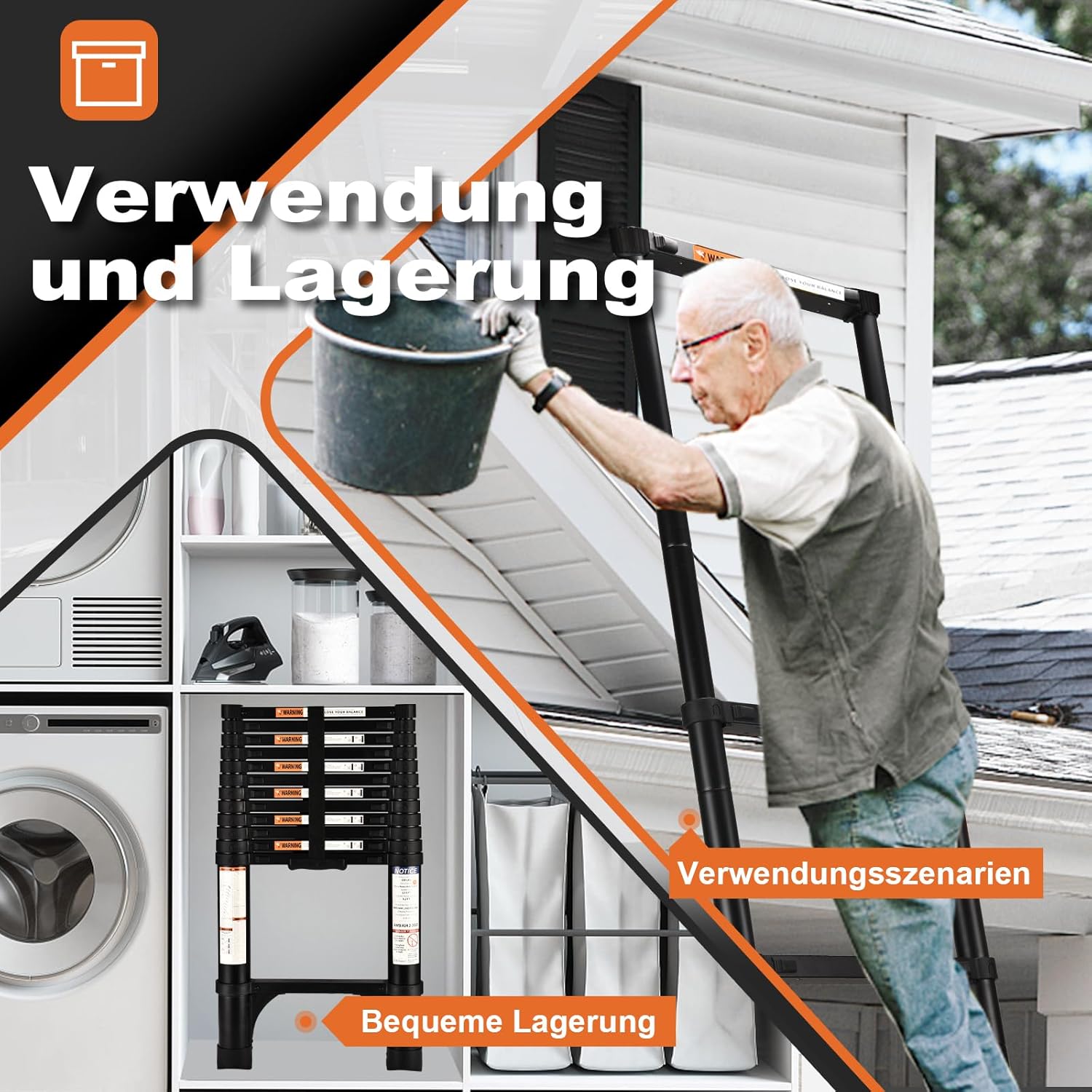 - Vielseitige Nutzung: Ob beim Wechseln von Glühbirnen im Innenbereich, beim Zugang zum Dachboden, bei der Reparatur von Dächern im Aussenbereich oder beim Besteigen eines Wohnmobils – unsere teleskopische Aluminiumlegierungsleiter ist für jede