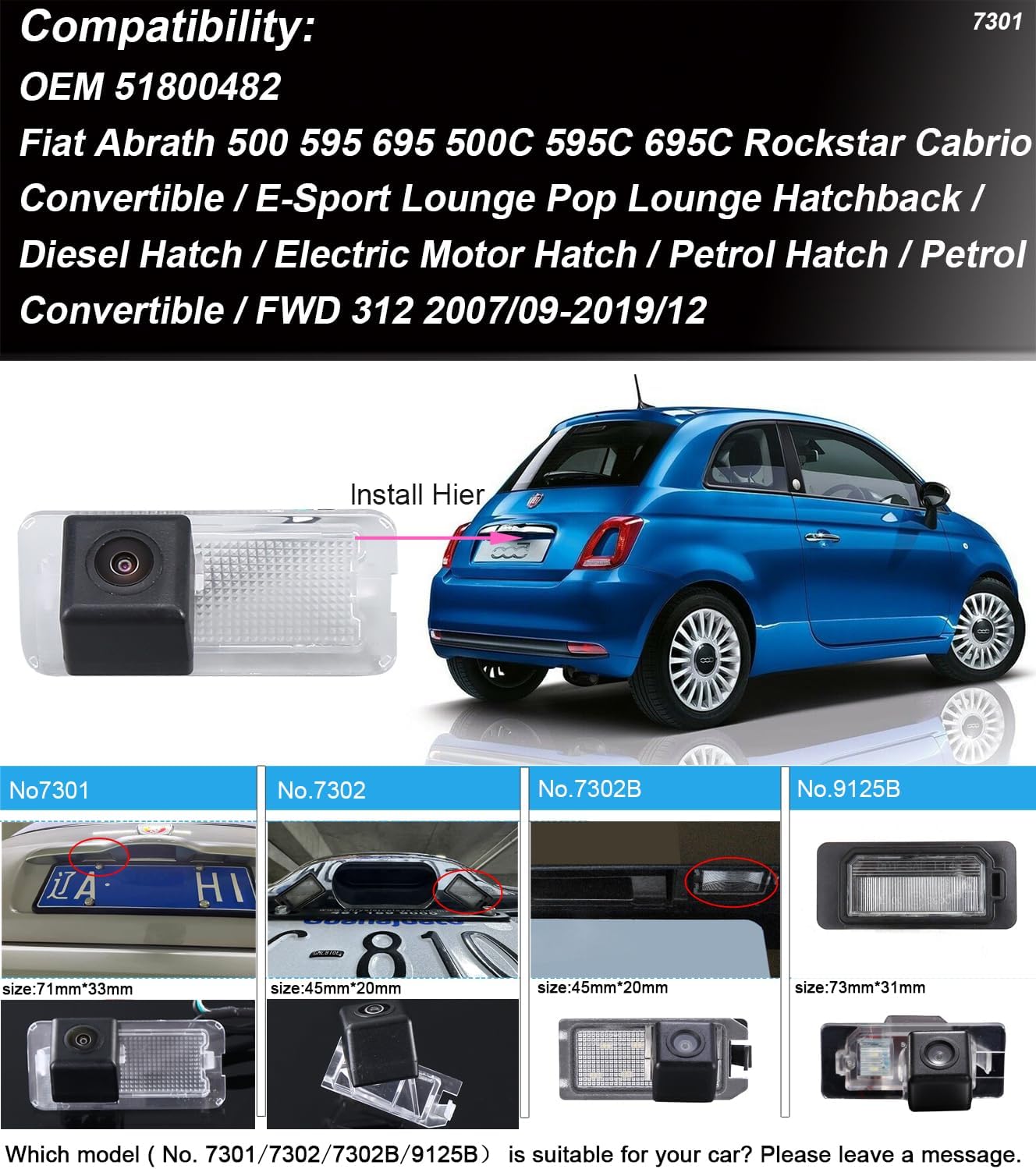 - ✔. Kompatibel mit Fiat 500 / Abarth 500 2007-2020 (choose No.7301); Kompatibel mit Fiat 500C/595C/695C/312C/Linea 2008-2022(choose No.7301); Kompatibel mit Fiat 500X 2014-2019 (choose No.9125); Kompatibel mit Fiat 500 595 / 695 2013-2019 (USA Model