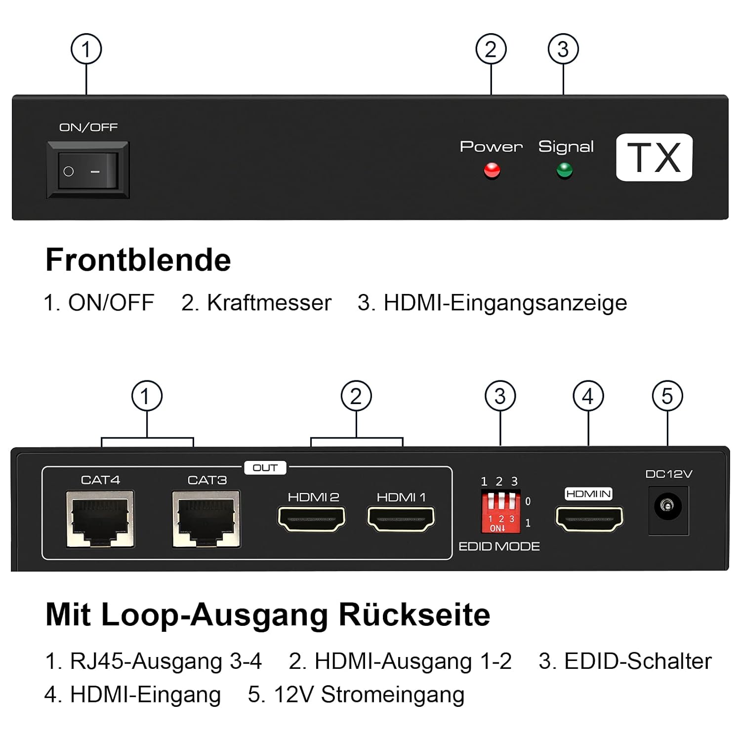 - 【POC-Technologie】 Bei Verwendung der POC-Technologie müssen wir nur die Stromversorgung vom Sender verwenden, und der Rx kann durch die Übertragung von Strom über das Netzwerkkabel arbeiten. Niederspannungsübertragung von 5V, sicher und zuverlässig. (Hinweis: TX muss an eine 12V-Stromversorgung angeschlossen werden, sonst wird das Gerät beschädigt.)