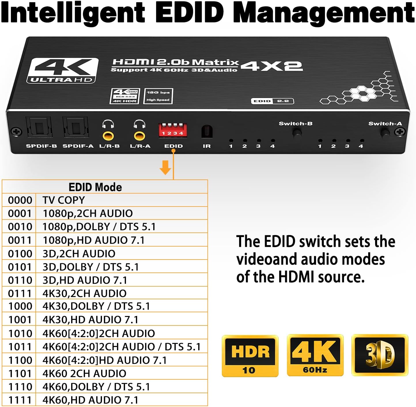 - 【HDMI Audio Extractor und EDID】: HDMI Matrix spdif Unterstützt Dolby Atmos, Dolby Vision; Unterstützt LPCM / Dobly / DTS 5.1-Kanälen; Unterstützt LPCM / DTS / Dolby-AC3-Audioformat; Unterstützt intelligentem EDID-Management; Mit zwei 3,5mm