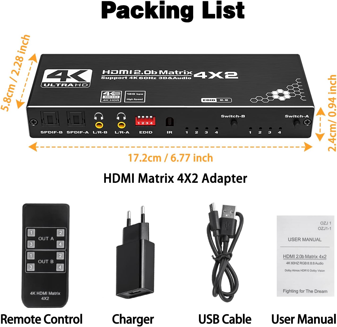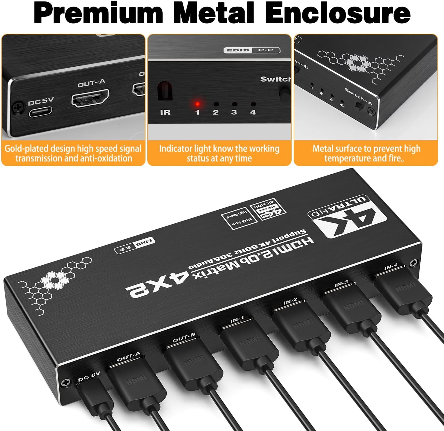 - 【4K@60Hz Ultra HD-Auflösung】: Dieser 4K 4x2 HDMI-Matrix unterstützt HDMI-Auflösung bis zu 4K@60Hz, abwärtskompatibel mit 4K@30Hz, 1080p@120Hz; Unterstützt HDCP 2.2, HDMI 2.0b, HDR 10, 3D, RGB 8: 8: 8; Unterstützung der Datenrate von 18,5 Gbit/s