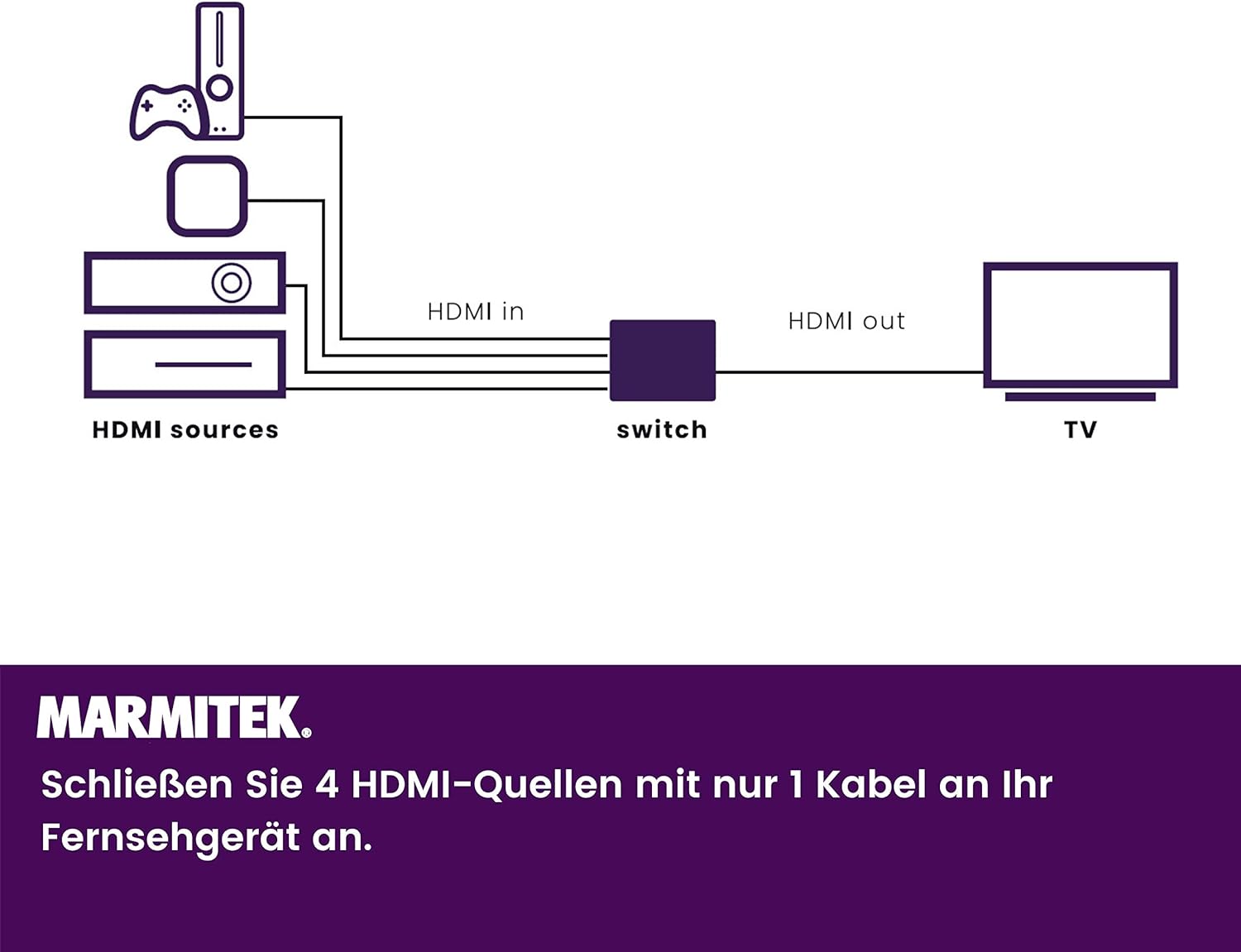 - 4 EINGÄNGE / 1 AUSGANG - Schliessen Sie 3 HDMI-Quellen an 1 HDMI-Anschluss an. Praktisch, wenn Ihr Fernseher zu wenige HDMI-Anschlüsse hat, um alle Ihre Geräte anzuschliessen