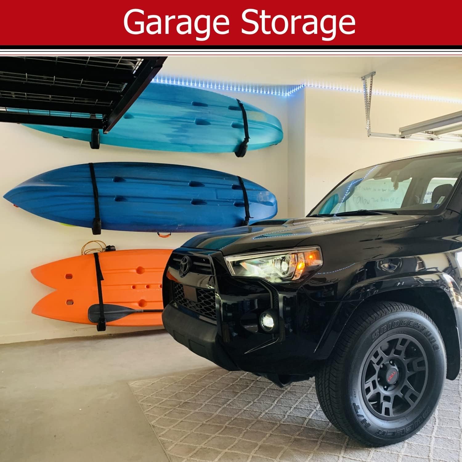 - 【VERSTELLBARER NYLONGURT】Kanu-Aufbewahrungsgestell Mit den mitgelieferten 3 m Nylongurten und -clips fallen Ihr Kajak oder Ihre Stand-up-Paddle-Boards nicht aus dem Deckenregal. Sie können die Länge des Riemens anpassen, um ihn an die Grösse des