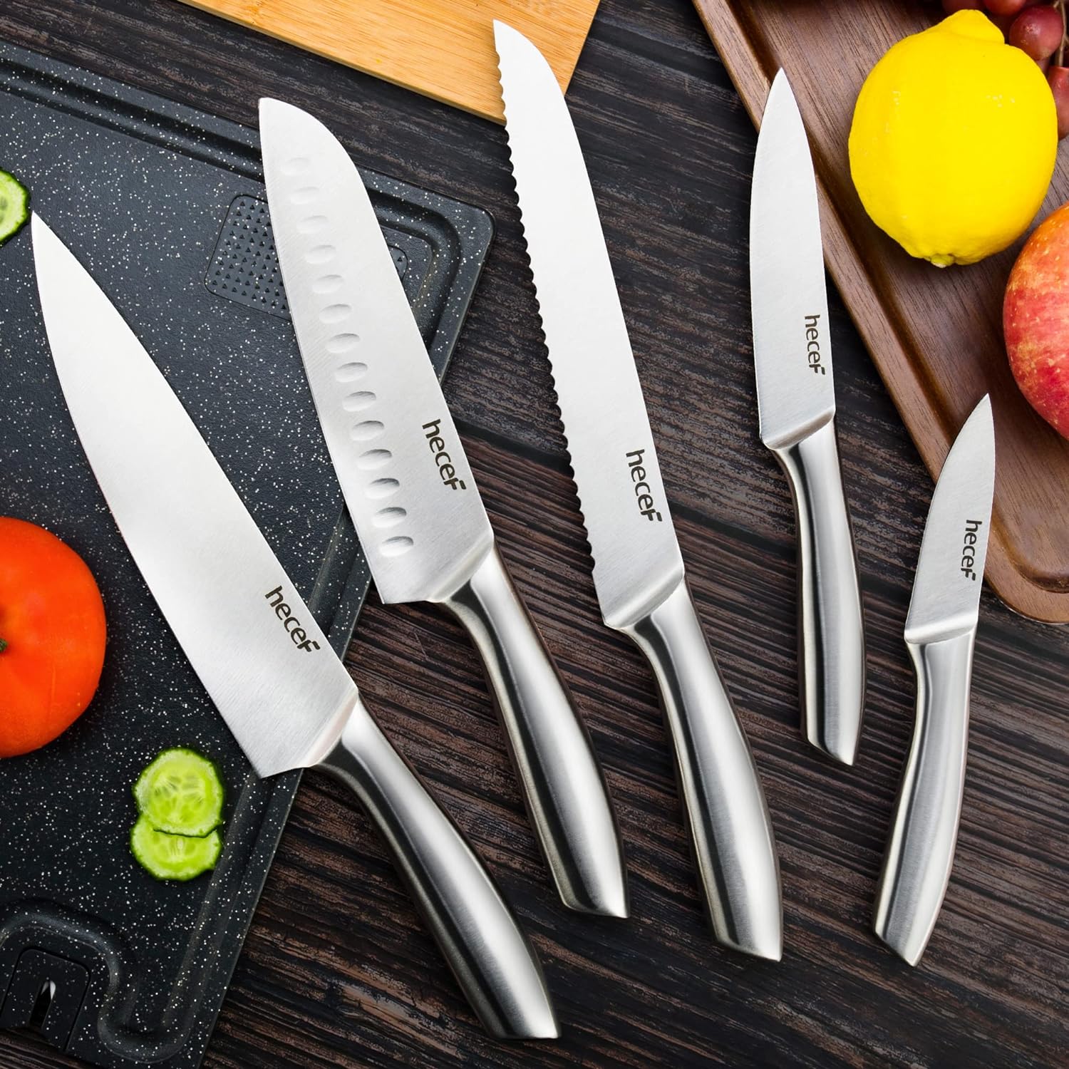 - Multifunktionale Küchenmesser - Eine Vielzahl von Messern für Ihre Bedürfnisse, 8'' Kochmesser, 8'' Brotmesser, 7'' Santokumesser, 5'' Allzweckmesser, 3,5'' Schälmesser und 5 Stück Messerscheiden.