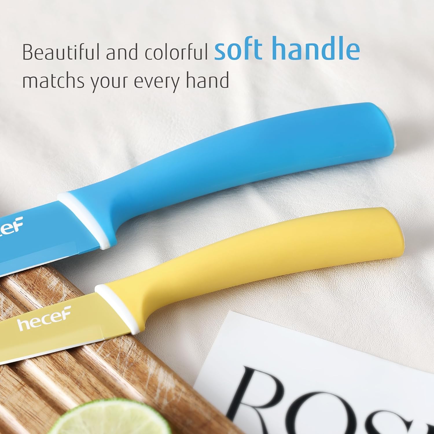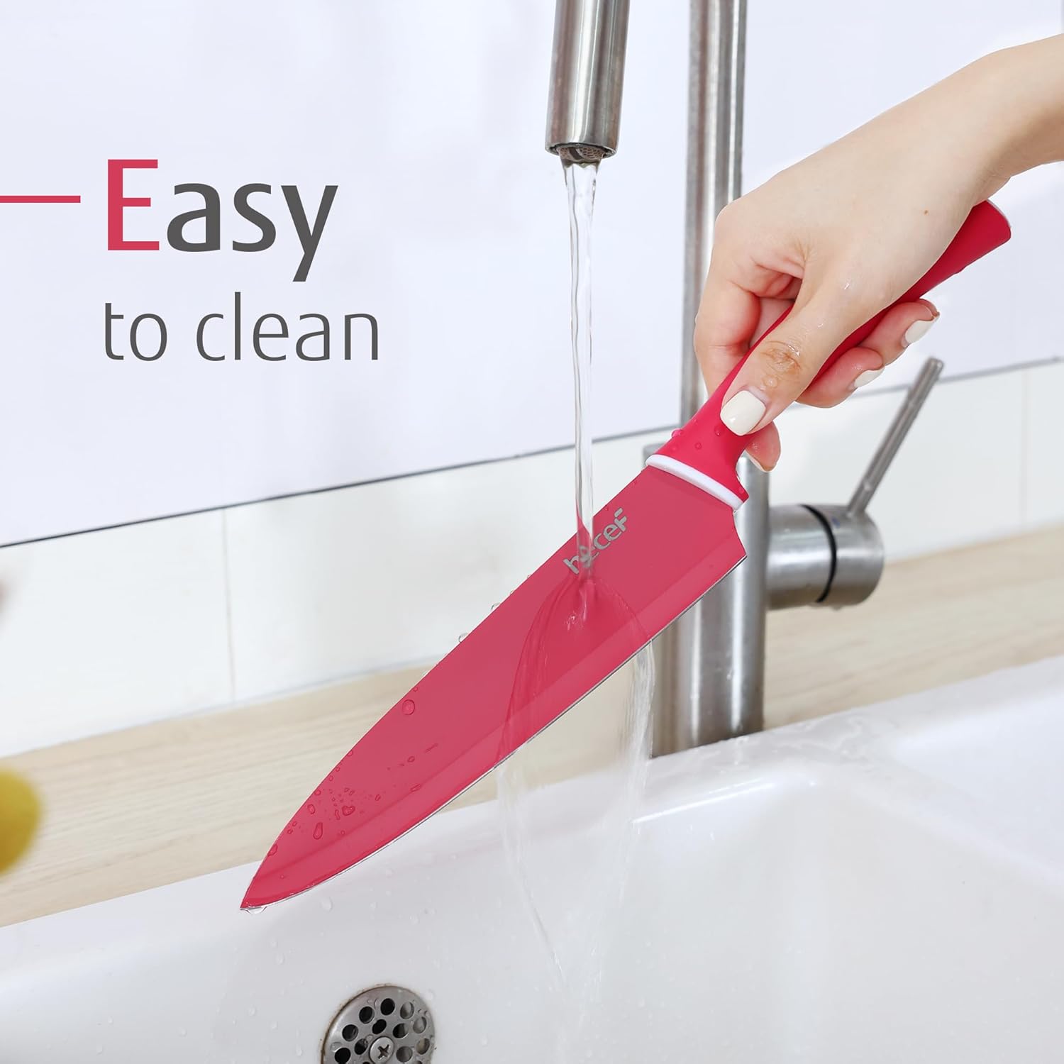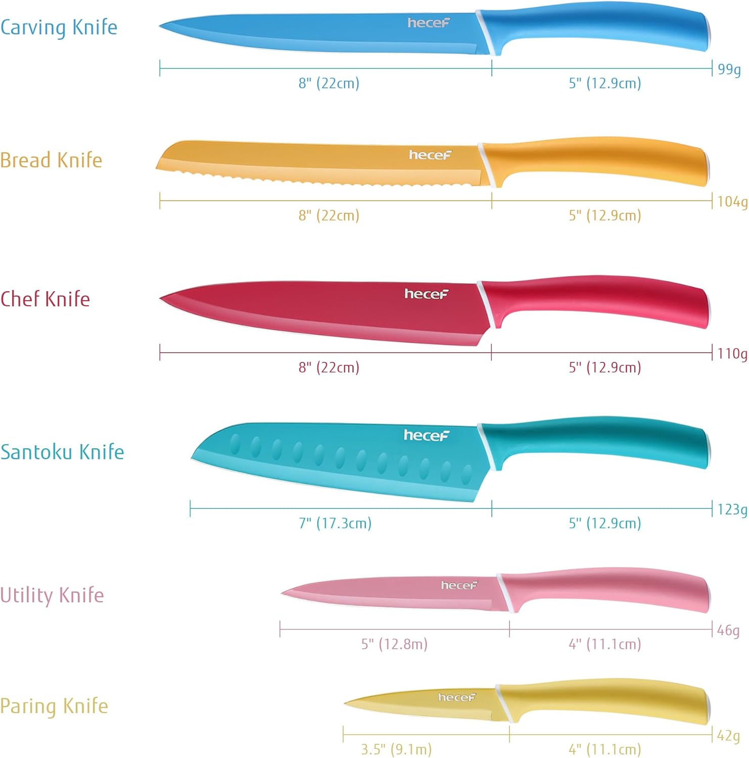 - Auffälliges Profi-Messer-Set: Dieses farbenfrohe Küchenmesserset enthält ein 8-Zoll-Kochmesser, ein 8-Zoll-Brotmesser, ein 8-Zoll-Schnitzmesser, ein 7-Zoll-Santoku-Messer, ein 5-Zoll-Utility-Messer und ein 3,5-Zoll-Schneidemesser für alle Ihre