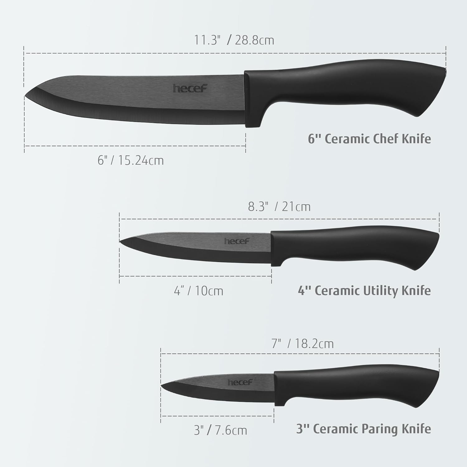 - Einfach und gesund: Das 3-teilige Keramikmesser-Set besteht aus einem 6-Zoll-Kochmesser, einem 4-Zoll-Utility-Messer und einem 3-Zoll-Obstschälmesser sowie passenden Scheiden. Lassen Sie dieses Messerset Ihre tägliche köstliche Küche meistern!