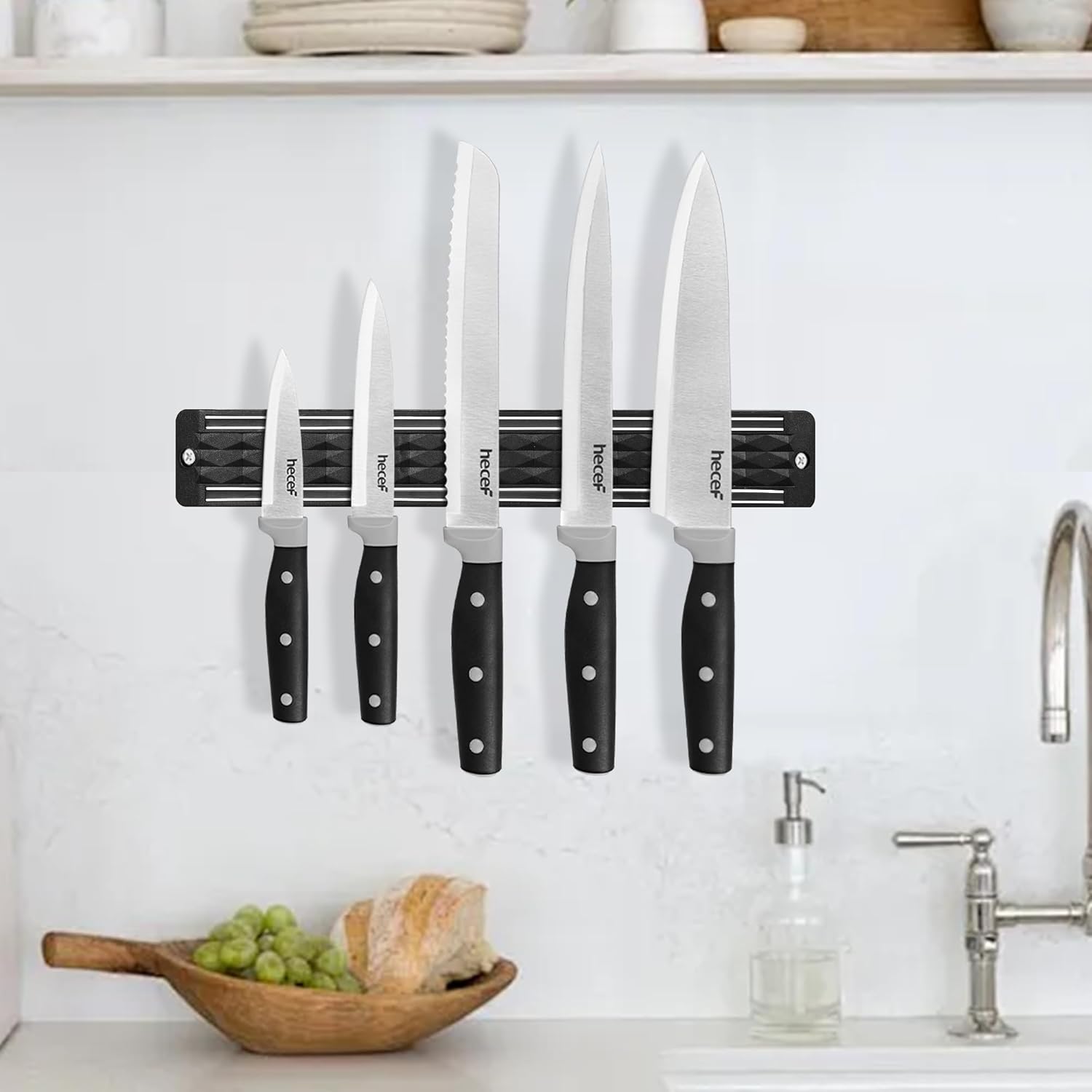 - Professionelles Küchenmesserset : Enthält 13'' magnetische Messerleiste, 8'' Kochmesser, 8'' Tranchiermesser, 8'' Brotmesser, 5'' Universalmesser, 3,5'' Schälmesser. Das neue Messerset wird Ihnen eine neue Erfahrung bieten, um Ihre professionellen und