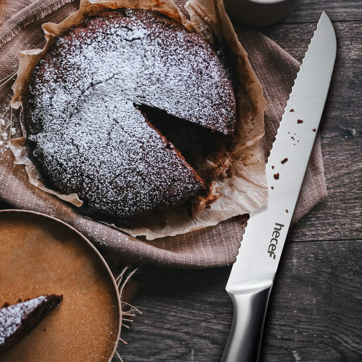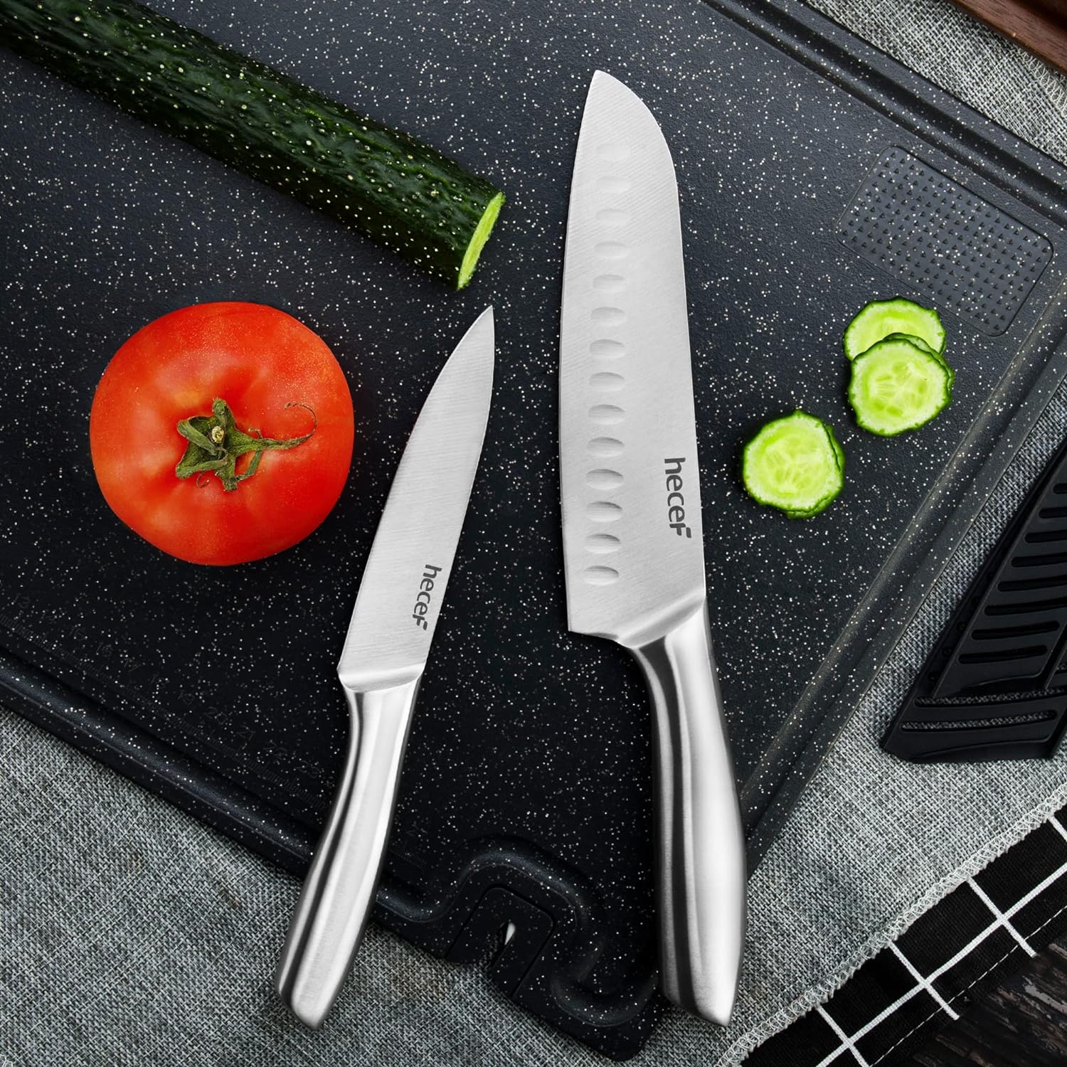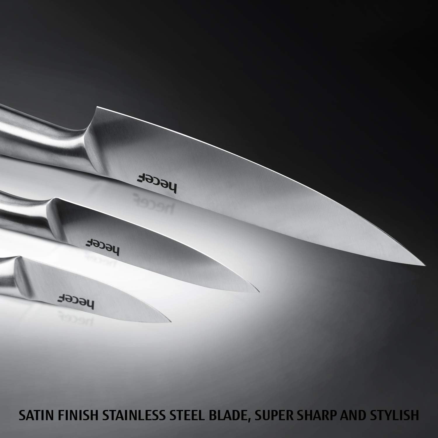 - UNERLÄSSLICHER KOCHMESSERSATZ: Das Hecef-Hohlgriff-Kochmessersatz besteht aus einem 8-Zoll-Chefmesser, einem 8-Zoll-Brotmesser, einem 7-Zoll-Santokumesser, einem 5-Zoll-Gebrauchsmesser und einem 3-Zoll-Putzmesser, das gleich mehrere Kochbedürfnisse auf einmal erfüllt.