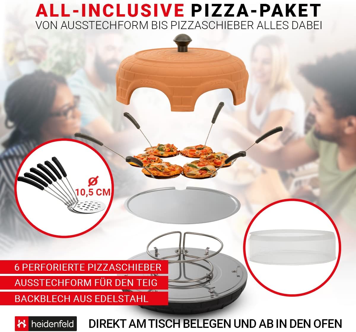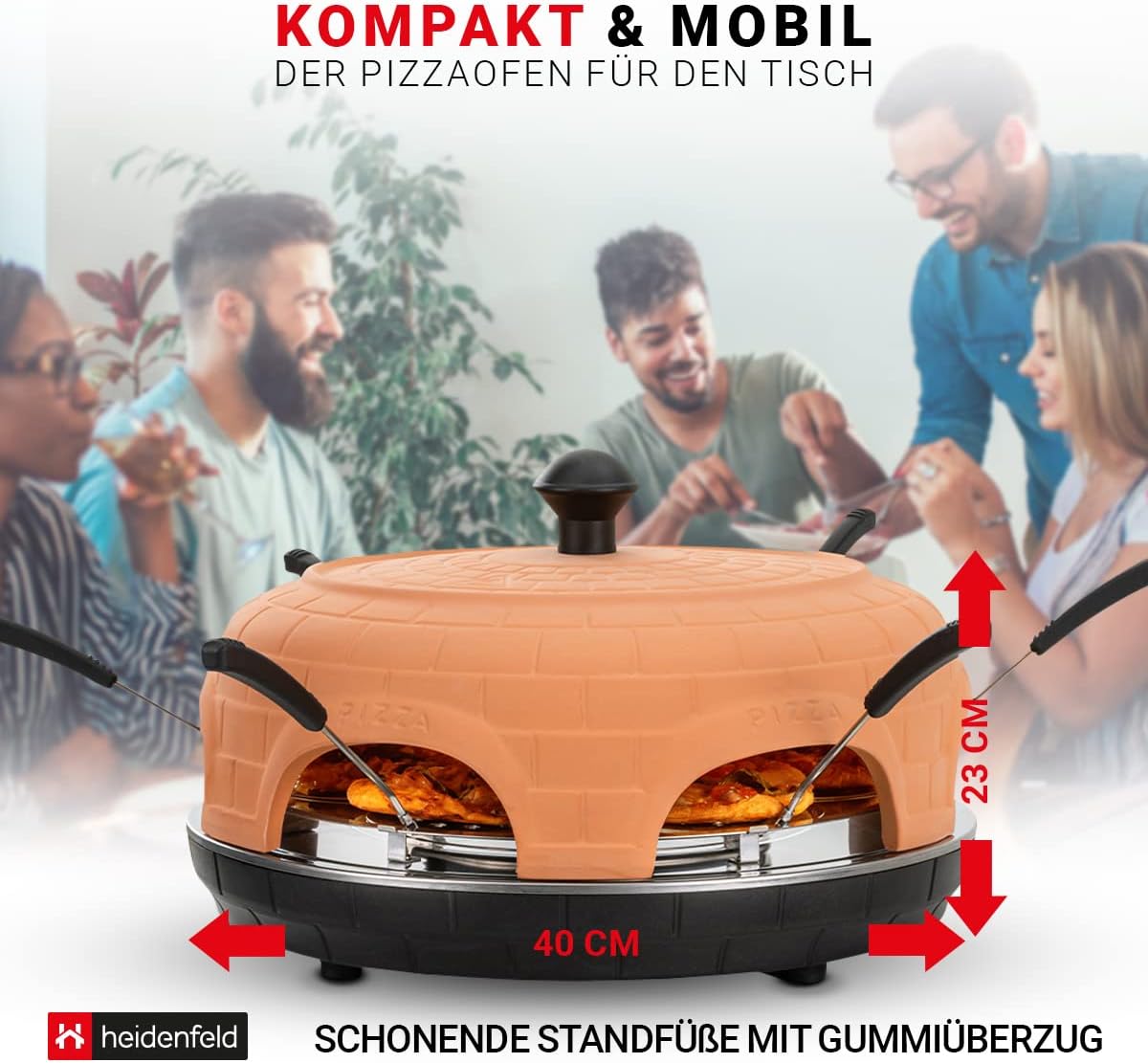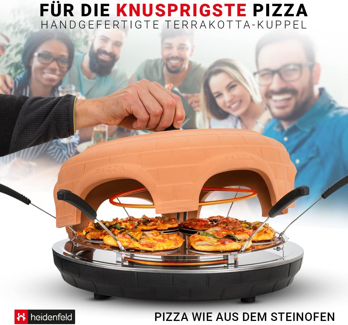 - ✔ Heidenfeld Pizzaofen ✔ Mit echter Terracotta-Kuppel ✔ Leistung ► 1000 Watt ✔ Arbeitstemperatur bis 300° C ✔ Pizzaschieber perforiert 10.5 cm