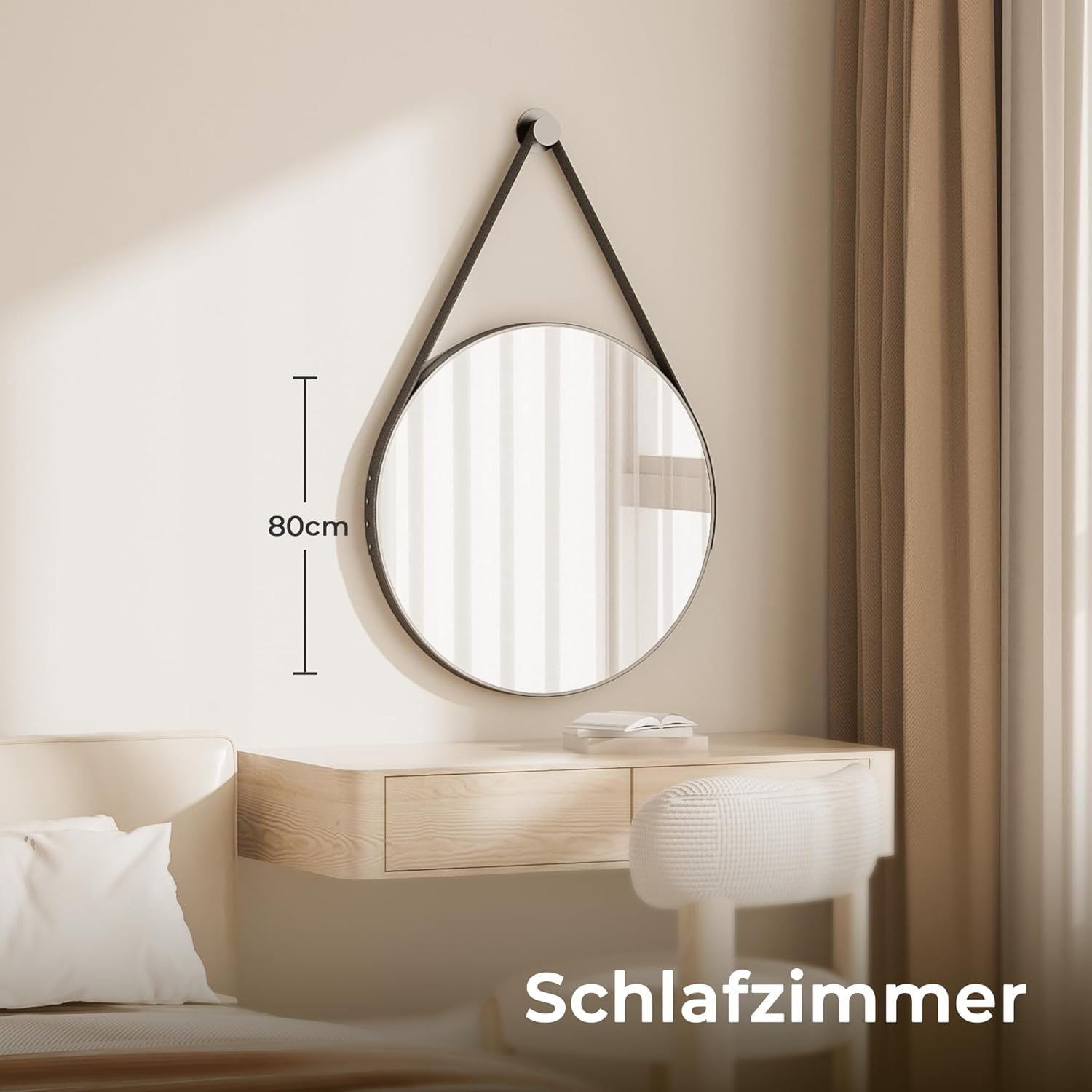 - 【ZWEI INSTALLATIONS METHODEN】 Spiegel schwarz rund Wird mit zubehörhaken und schwarzem riemen,Befestigungshaken und Aufhängegurt in Lederoptik für eine dekorative Wandmontage und der ledergürtel kann in der länge angepasst und nach bedarf installiert oder entfernt werden. Montage auch ohne Aufhängegurt möglich.
