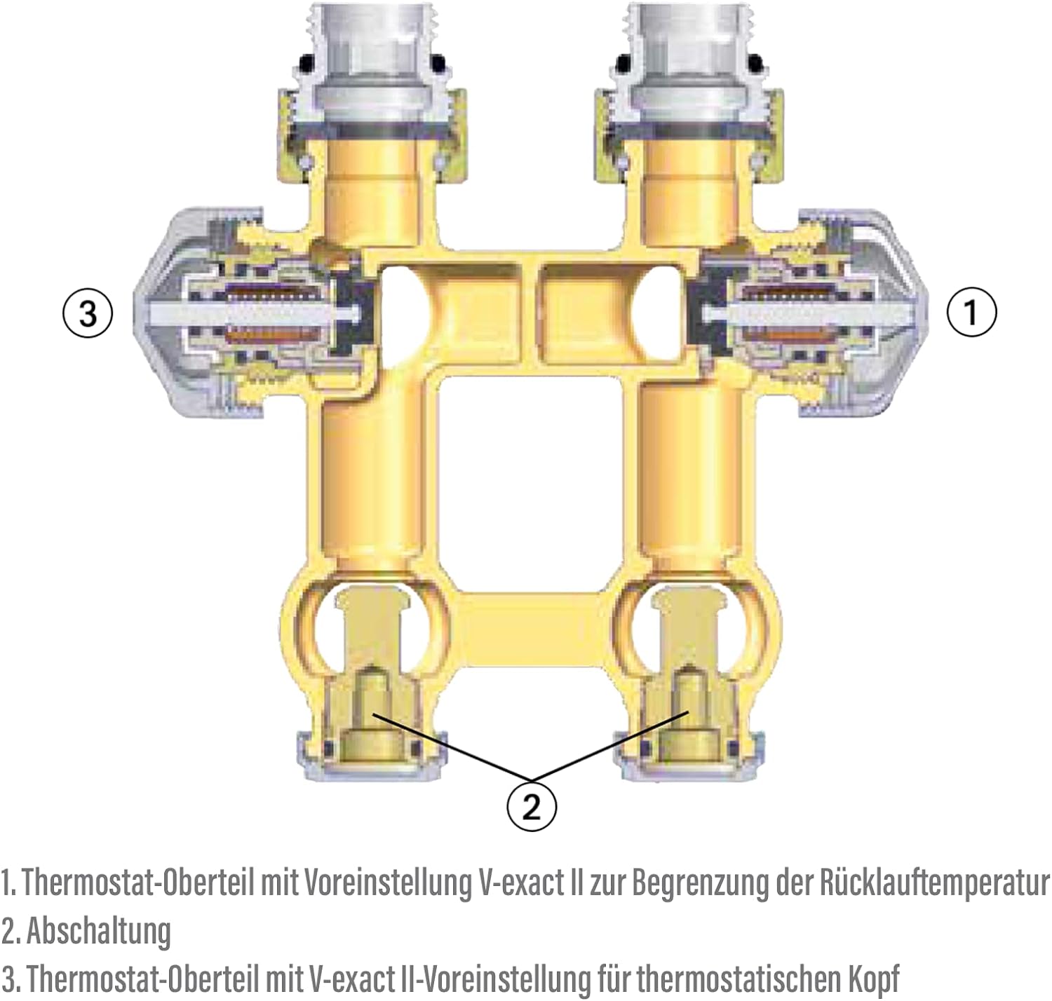 - Thermostatkopf mit V-exact-II-Präzisionsvoreinstellung mit 8 stufenlosen Voreinstellwerten, Heizkörperanschluss mittels R 1/2 und G 3/4