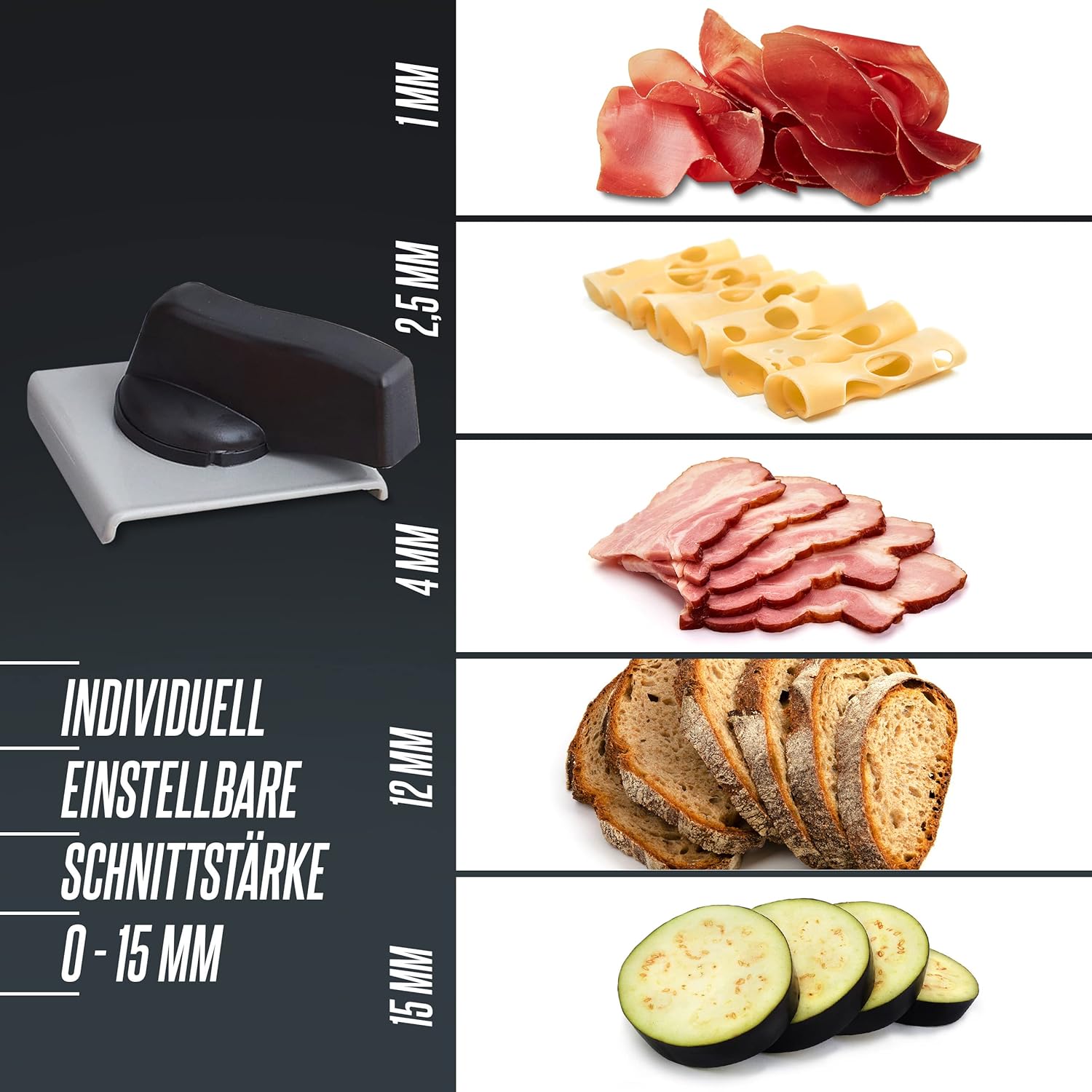 - 💪 LEISTUNGSSTARK- Ein kraftvoller 200W Motor und das Ø19cm scharfe Edelstahl-Rundmesser sorgen für einen gleichmässigen und scharfen Schnitt. Übrigens können Sie dank der stufenlos einstellbaren Schnittstärke von 0-15mm die Scheibendicke Ihren