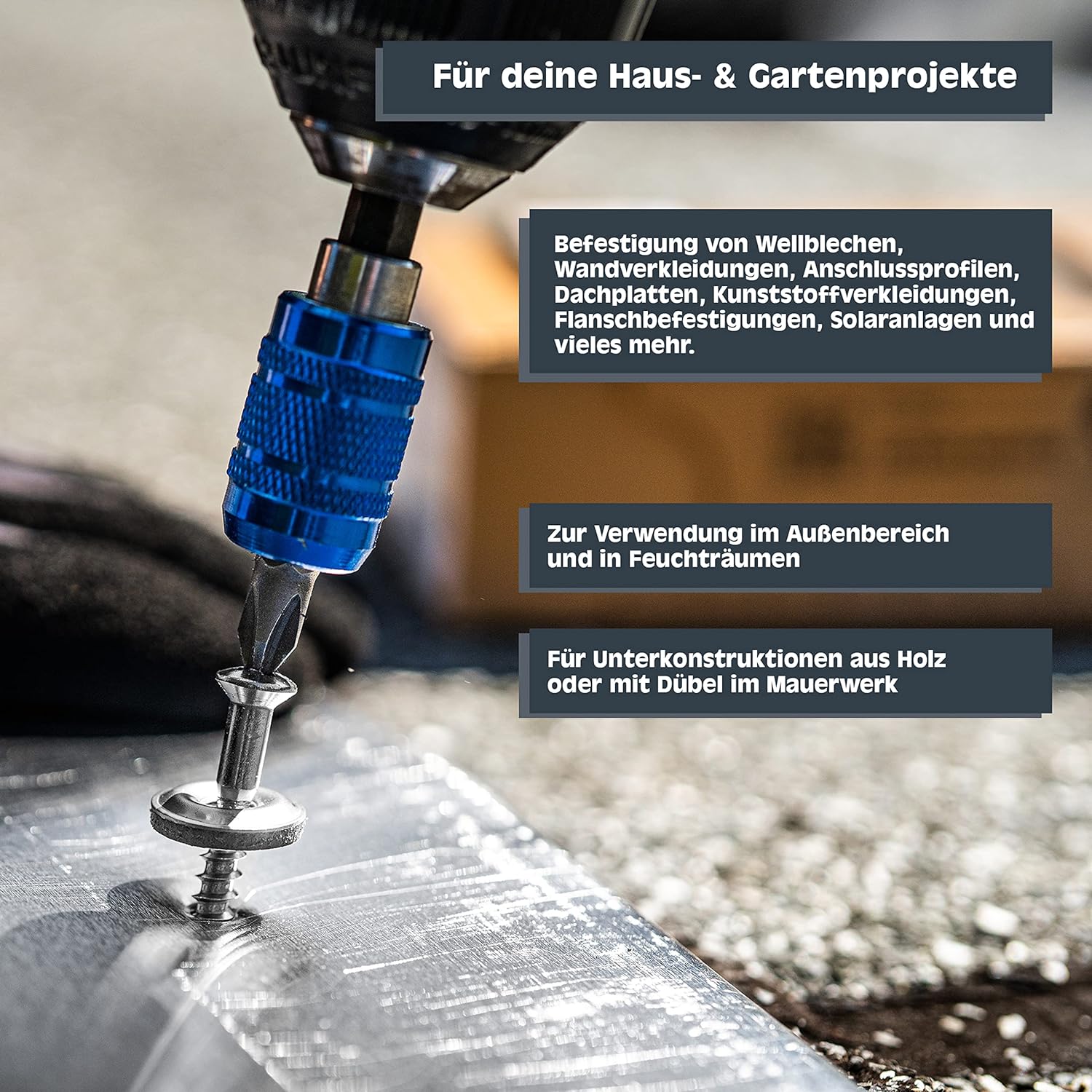 - EINSATZBEREICHE: Befestigung von Wellblechen, Wandverkleidungen, Anschlussprofilen, Dachplatten, Kunststoffverkleidungen, Flanschbefestigungen, Solaranlagen und vieles mehr.
