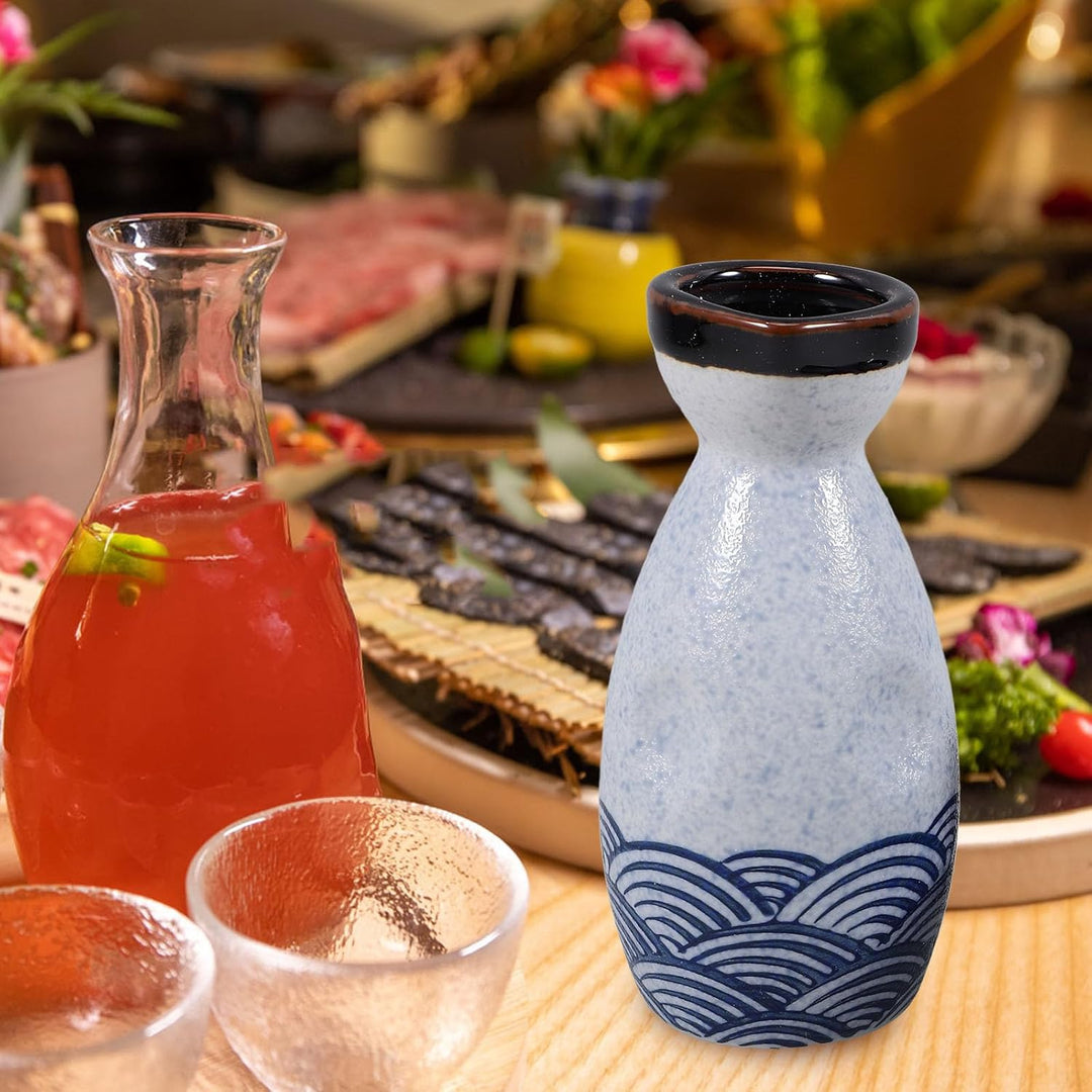 - Sake Tasse insgesamt ist in weiss blau Farbe passend Flaschenmund schwarze Farbe und Flaschenkörper Seewellenmuster.