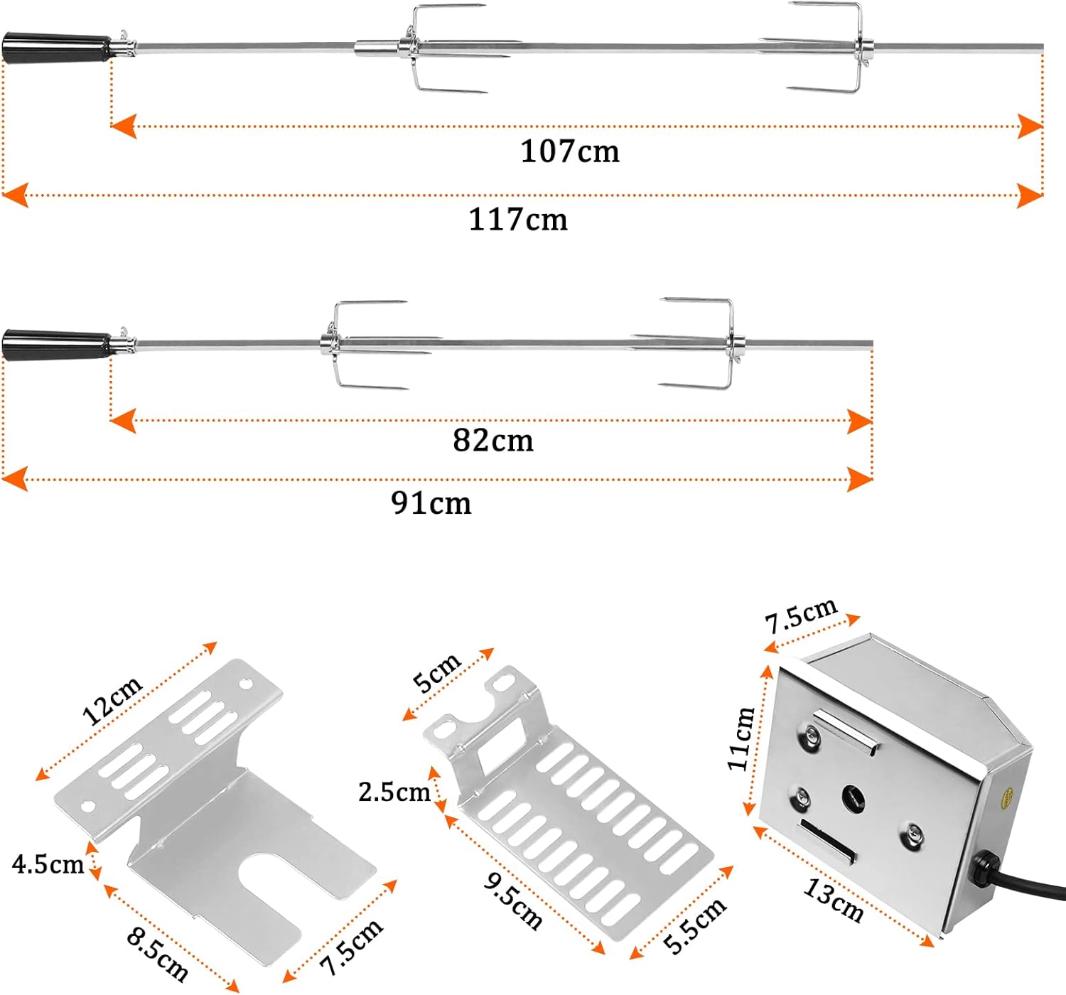 • [Komplettes Set] Dieses Edelstahl-Rotisserie-Grill-Kit enthält einen Elektromotor, eine 107 cm lange Spiessstange, 4 Zinken-Rotisserie-Gabeln (ein Paar), ein Halterungsset Alle Zubehörteile sind enthalten, um den Bedarf beim Grillen zu decken.