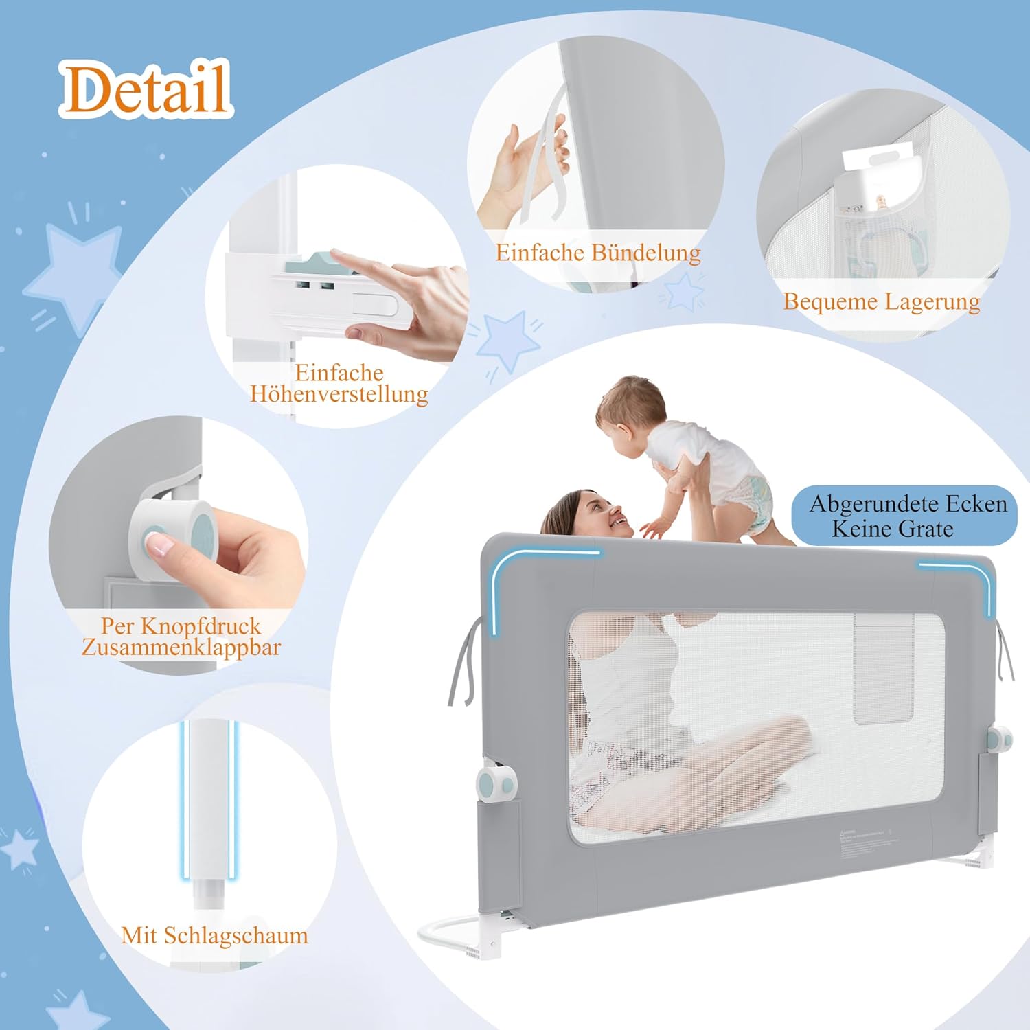 • 🛏️ SICHERES ZUVERLÄSSIGES BETTKANTENSCHUTZ KINDERBETT: Das Kinderbett-Geländer ist mit abgerundeten Ecken an den Montage- und Befestigungspunkten versehen, und die hochdichte, stossfeste Baumwollhülle verhindert, dass das Baby versehentlich