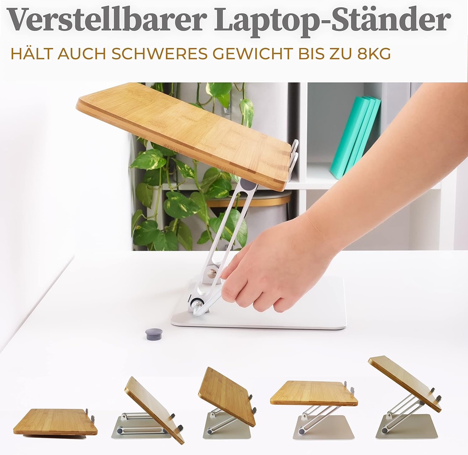 - STABILITÄT - Dank der verstellbaren Gelenke, die man sehr fest schrauben kann, ist ausreichend Stabilität gegeben. Der Macbook Ständer Holz kann somit auch hohes Gewicht von grossen Laptops aushalten - auch ideales iPad Zubehör/ Tablet Ständer!