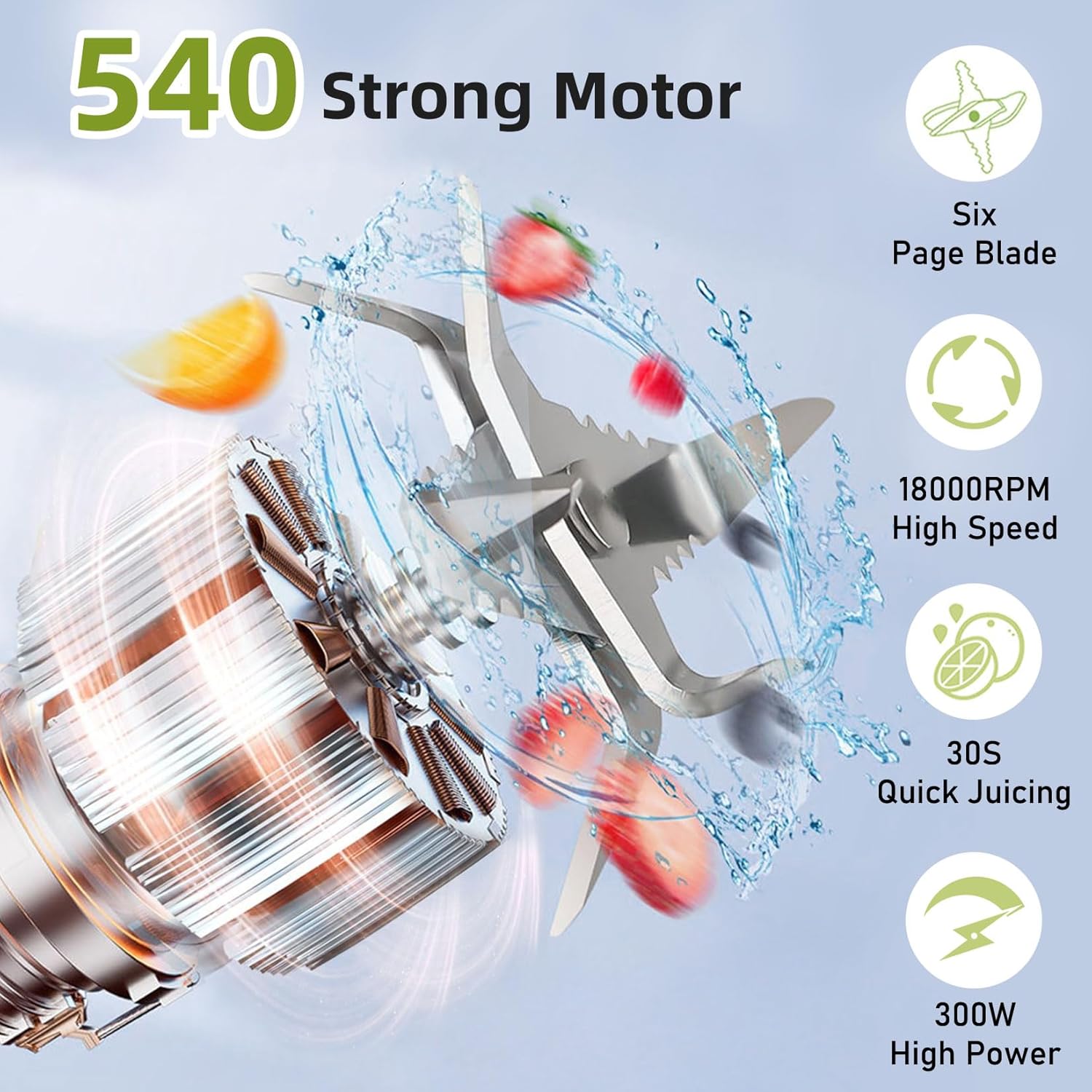 - đčăLeistungsstarkes Mixenă Ausgestattet mit einem leistungsstarken 2000-mAh*3-Akku und einem 300-W-Motor bietet der Tragbarer Mixer eine sorgenfreie, lange Akkulaufzeit. Die sechs Edelstahlklingen rotieren mit bis zu 18.000 U/min. In nur 30