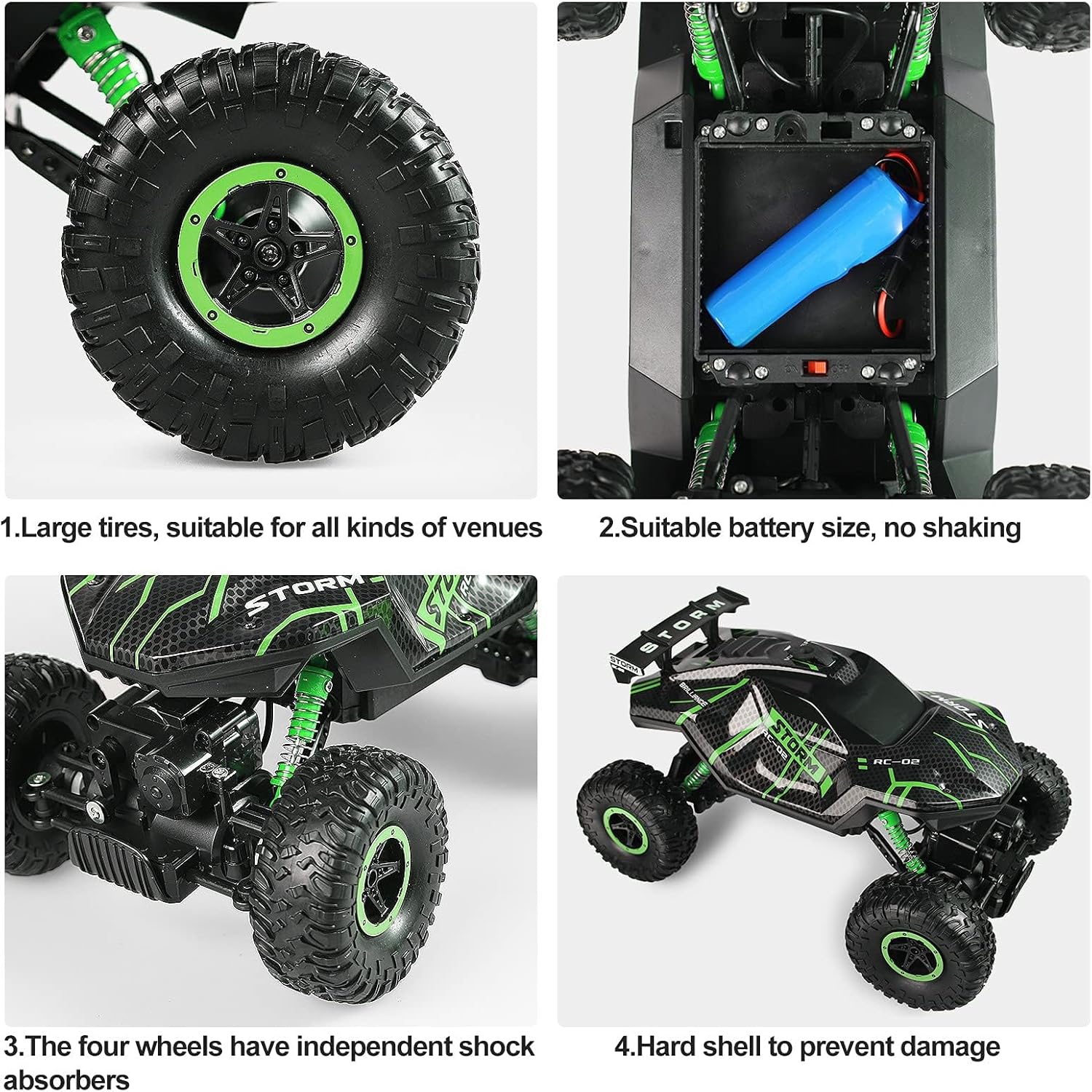 - 【Offroad RC Auto】Der geländewagen körper besteht aus hochwertigem ABS Kunststoff, der eine starke Crashfestigkeit aufweist, Vier Räder sind mit einer unabhängigen Aufhängungsfeder ausgestattet, das schützt die elektronischen Komponenten im