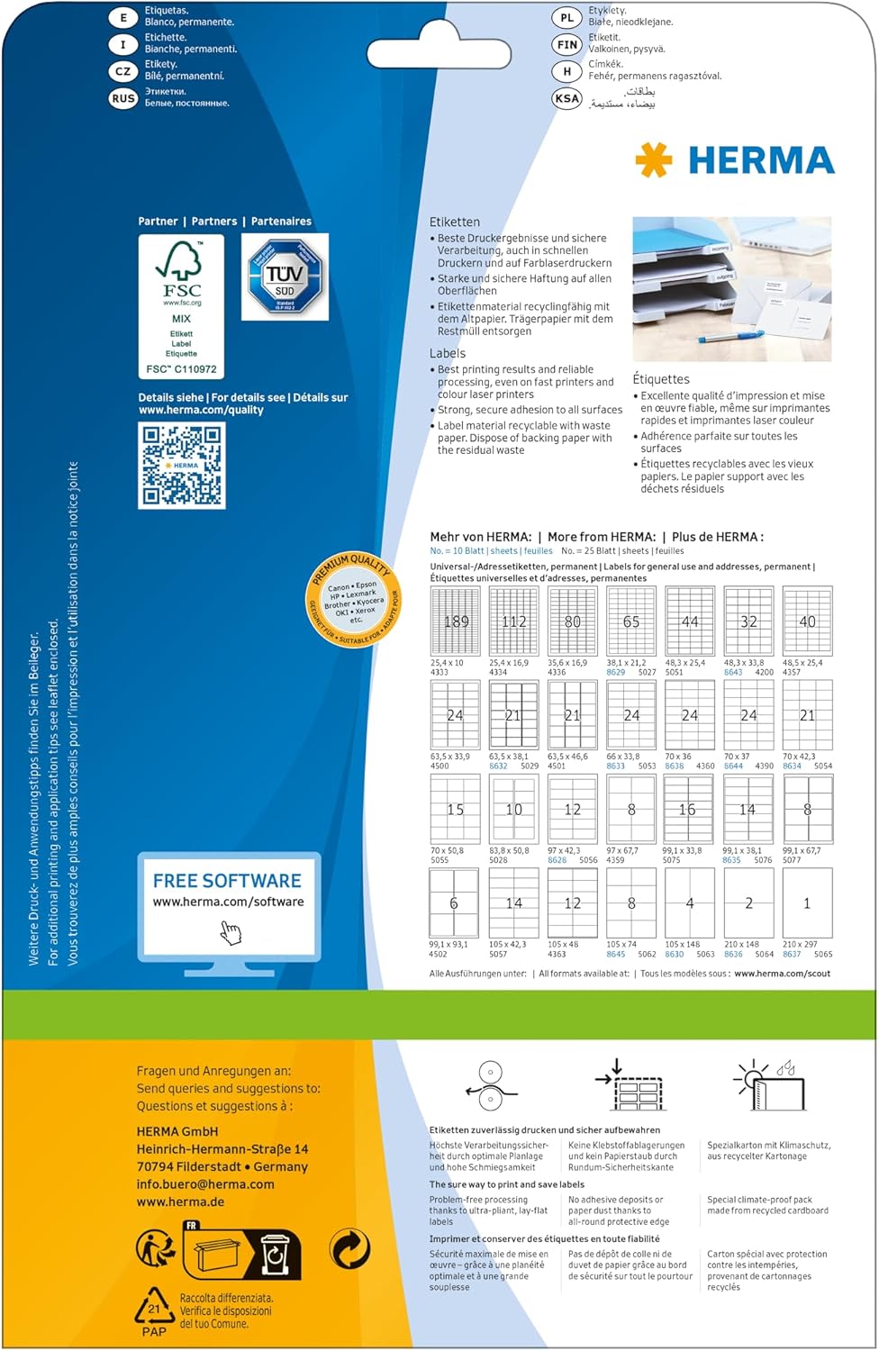 - Lieferumfang: 16800 x HERMA PREMIUM Etiketten, DIN A4 Format, 7 x 4,2 cm, rechteckig, weiss (800 Blatt je 21 Etiketten)