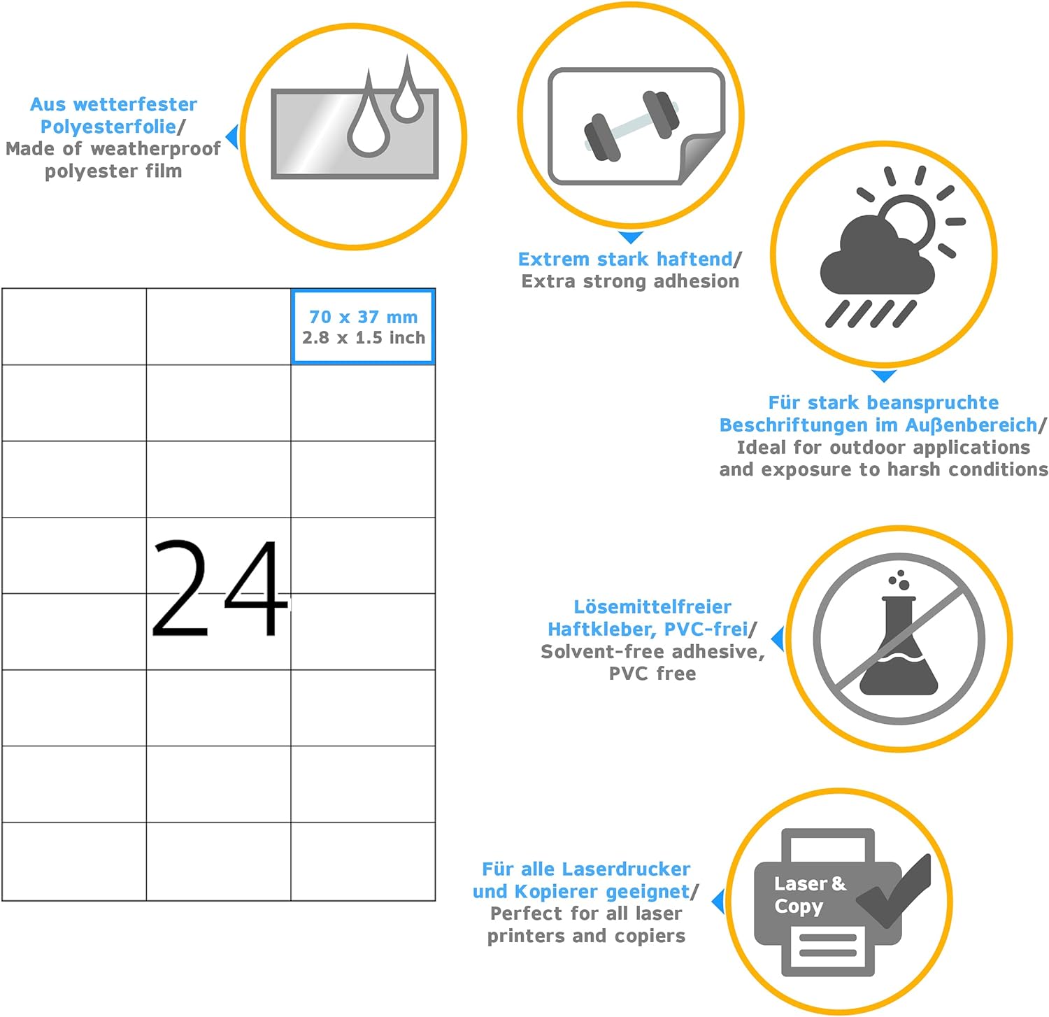 - Lieferumfang: 600 x HERMA Wetterfeste Folien-Etiketten, DIN A4 Format, 7 x 3,7 cm, rechteckig, weiss (25 Blatt je 24 Etiketten)