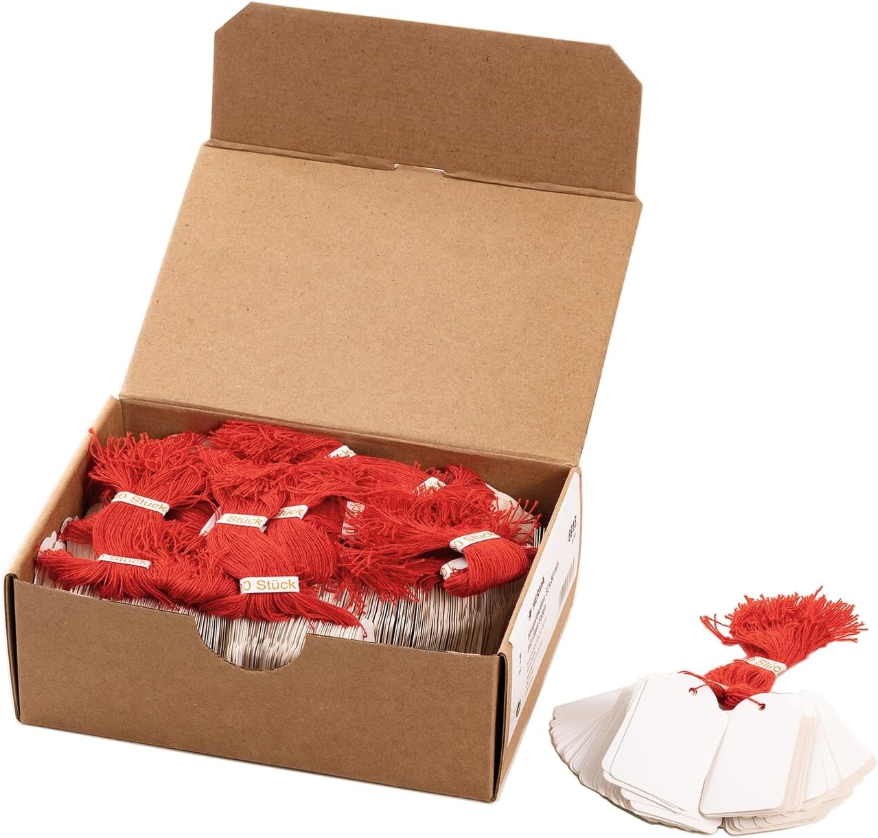 - Unbedruckte weisse Hängeetiketten mit Lochung und bereits eingefädelten rotem Faden