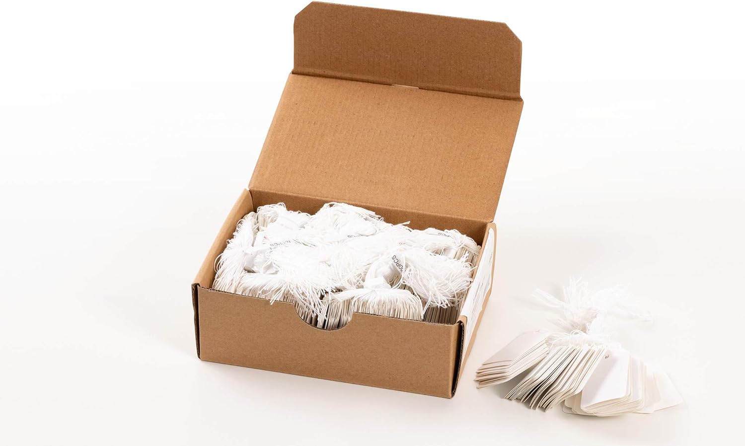 - Unbedruckte weisse Hängeetiketten mit Lochung und bereits eingefädelten weissem Faden