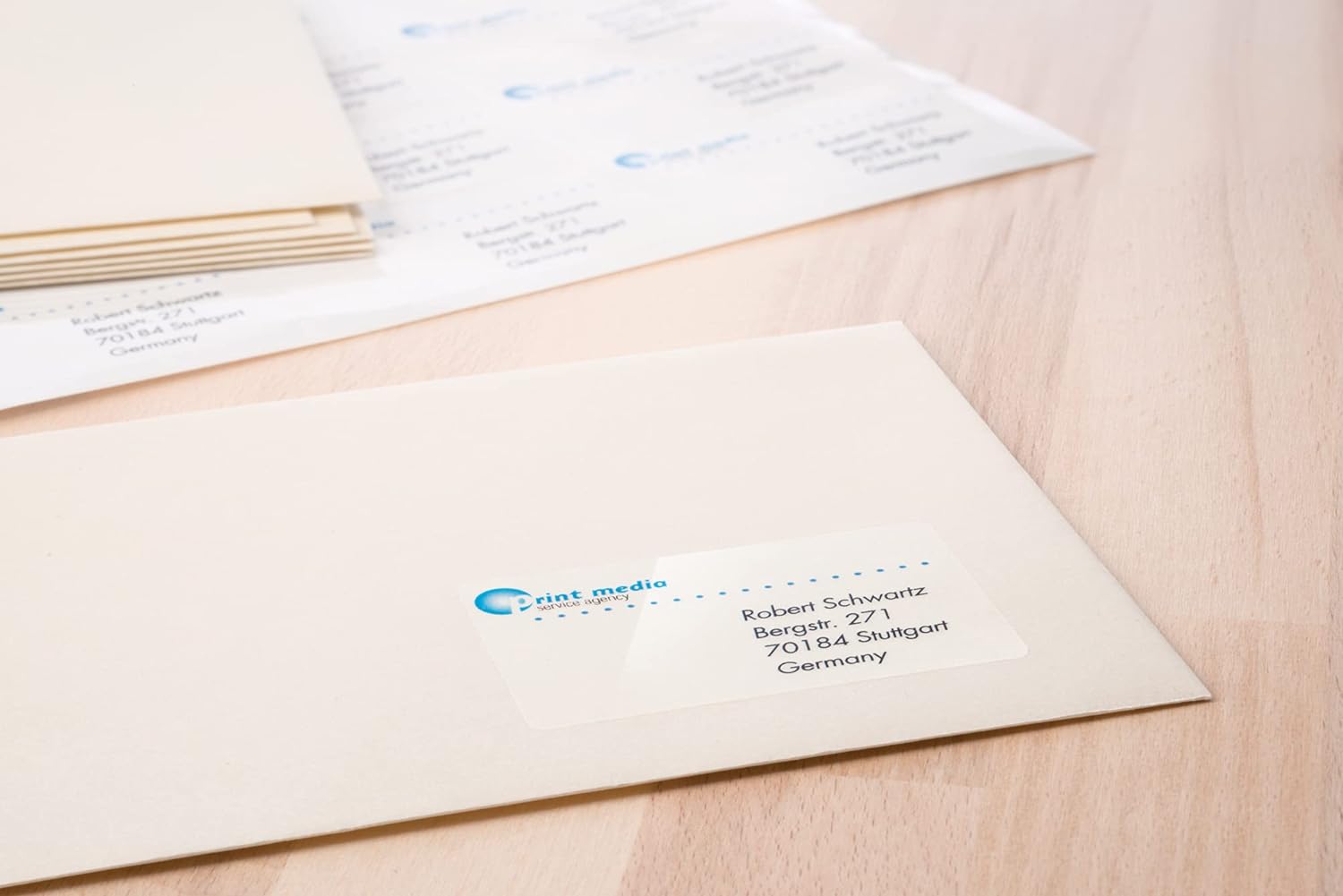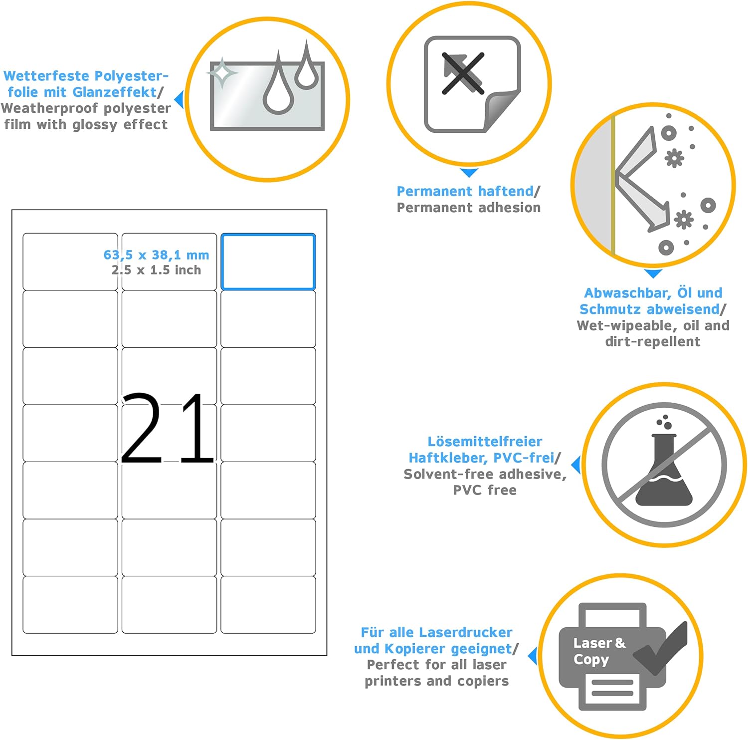 • Transparente, durchsichtige Klebeetiketten aus Folie auf A4-Blättern, hochglänzend, dauerhaft klebend. Wetterfest, alterungsbeständig, Öl und Schmutz abweisend, abwischbar