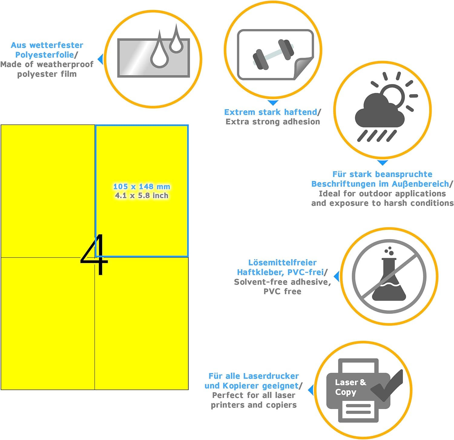 • Lieferumfang: 100 x HERMA Wetterfeste Folien-Etiketten, DIN A4 Format, 10,5 x 14,8 cm, rechteckig, gelb (25 Blatt je 4 Etiketten)