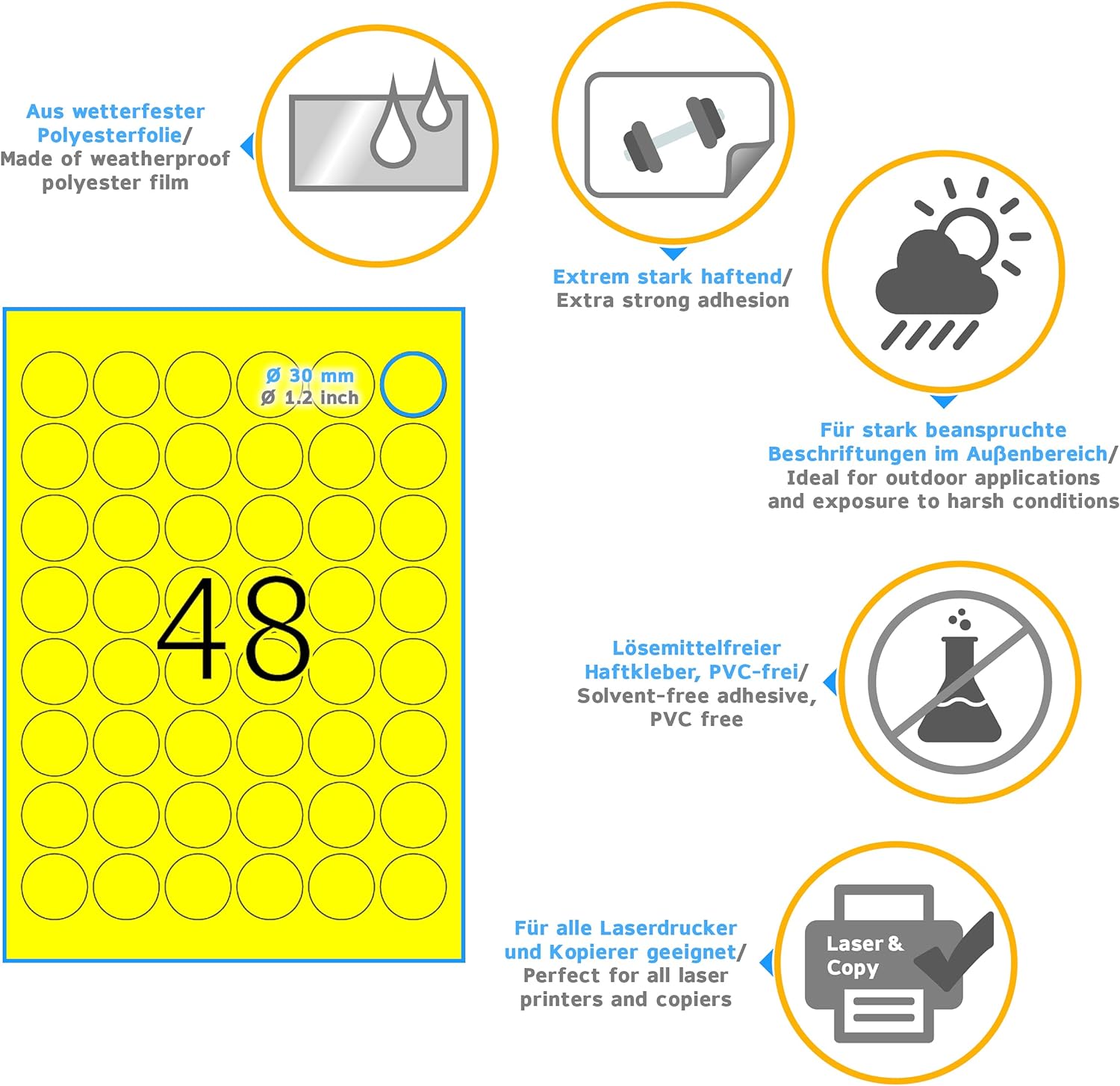 • Lieferumfang: 1200 x HERMA Wetterfeste Folien-Etiketten, DIN A4 Format, Ø 3 cm, rund, gelb (25 Blatt je 48 Etiketten)