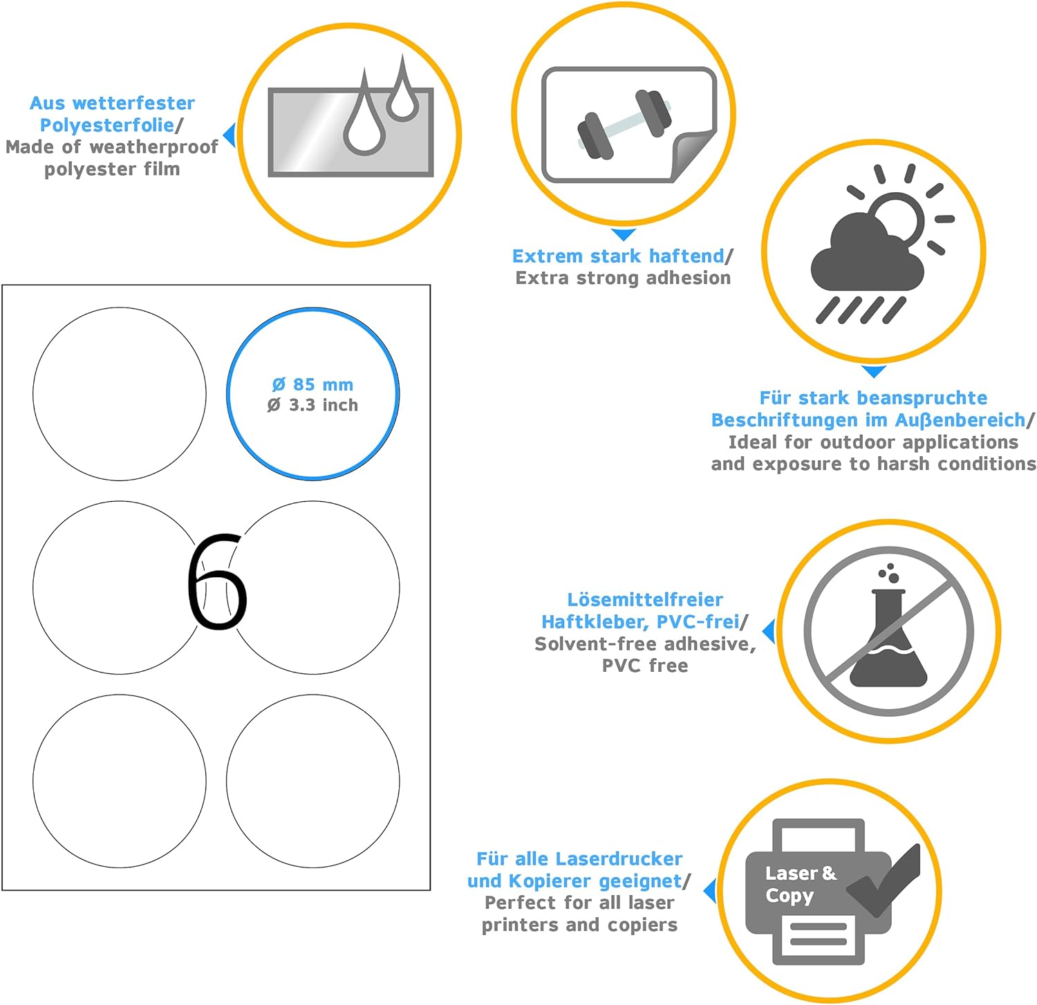 - Lieferumfang: 150 x HERMA Wetterfeste Folien-Etiketten, DIN A4 Format, Ø 8,5 cm, rund, weiss (25 Blatt je 6 Etiketten)