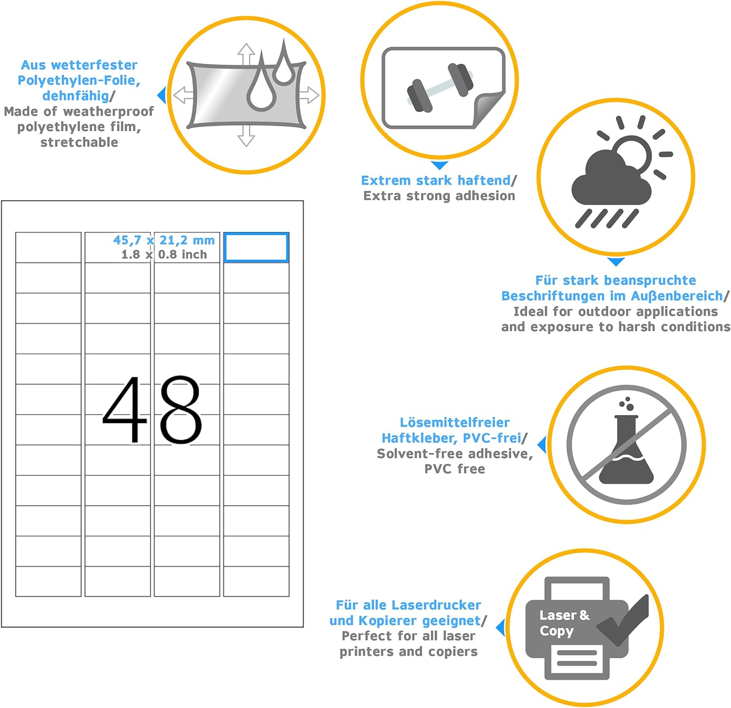 - Lieferumfang: 1920 x HERMA Wetterfeste Outdoor-Folienetiketten, DIN A4 Format, 4,57 x 2,12 cm, rechteckig, weiss (40 Blatt je 48 Etiketten)