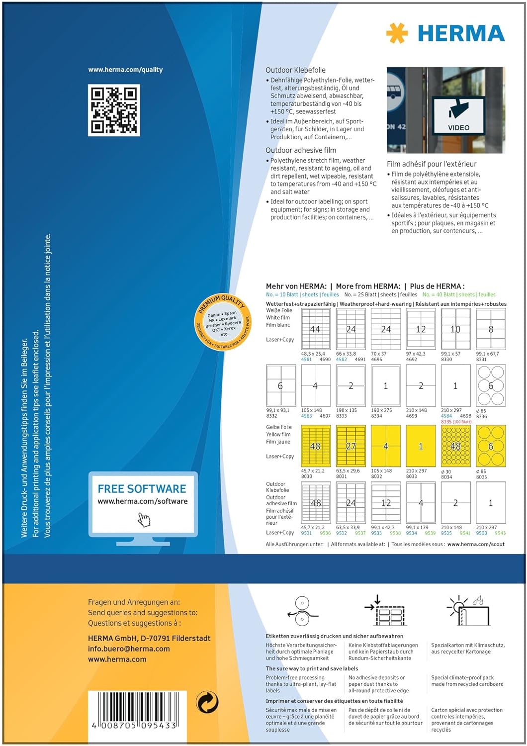 - Lieferumfang: 10 x HERMA Wetterfeste Outdoor-Folienetiketten, DIN A3 Format, 29,7 x 42 cm, rechteckig, weiss (10 Blatt je 1 Etikett)