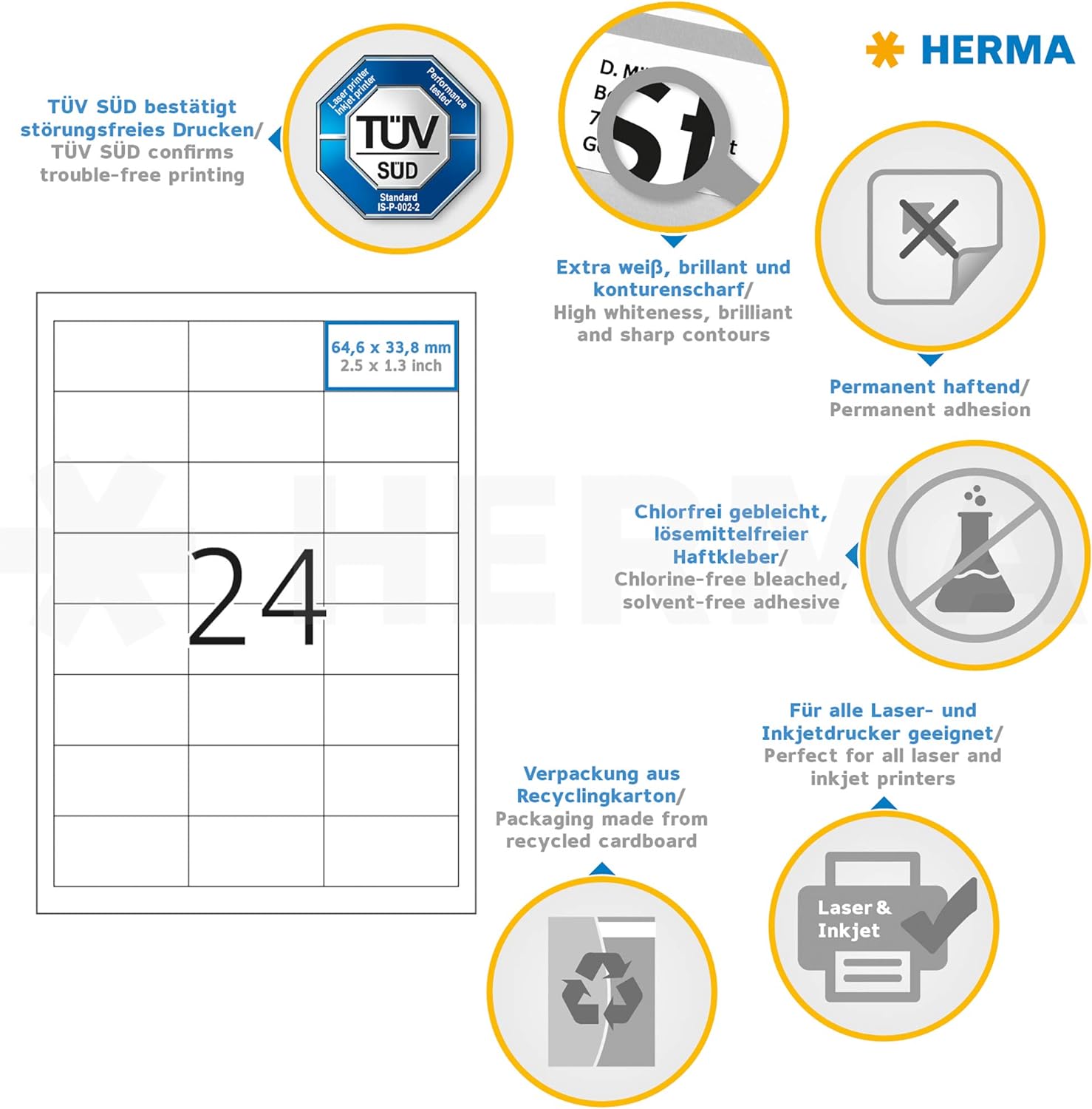 - Lieferumfang: 4800 x HERMA PREMIUM Etiketten, DIN A4 Format, 6,46 x 3,38 cm, rechteckig, weiss (200 Blatt je 24 Etiketten)