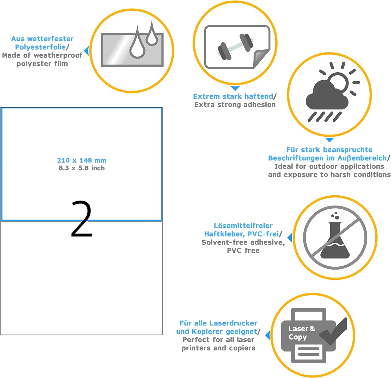 - Lieferumfang: 50 x HERMA Wetterfeste Folien-Etiketten, DIN A4 Format, 21 x 14,8 cm, rechteckig, weiss (25 Blatt je 2 Etiketten)
