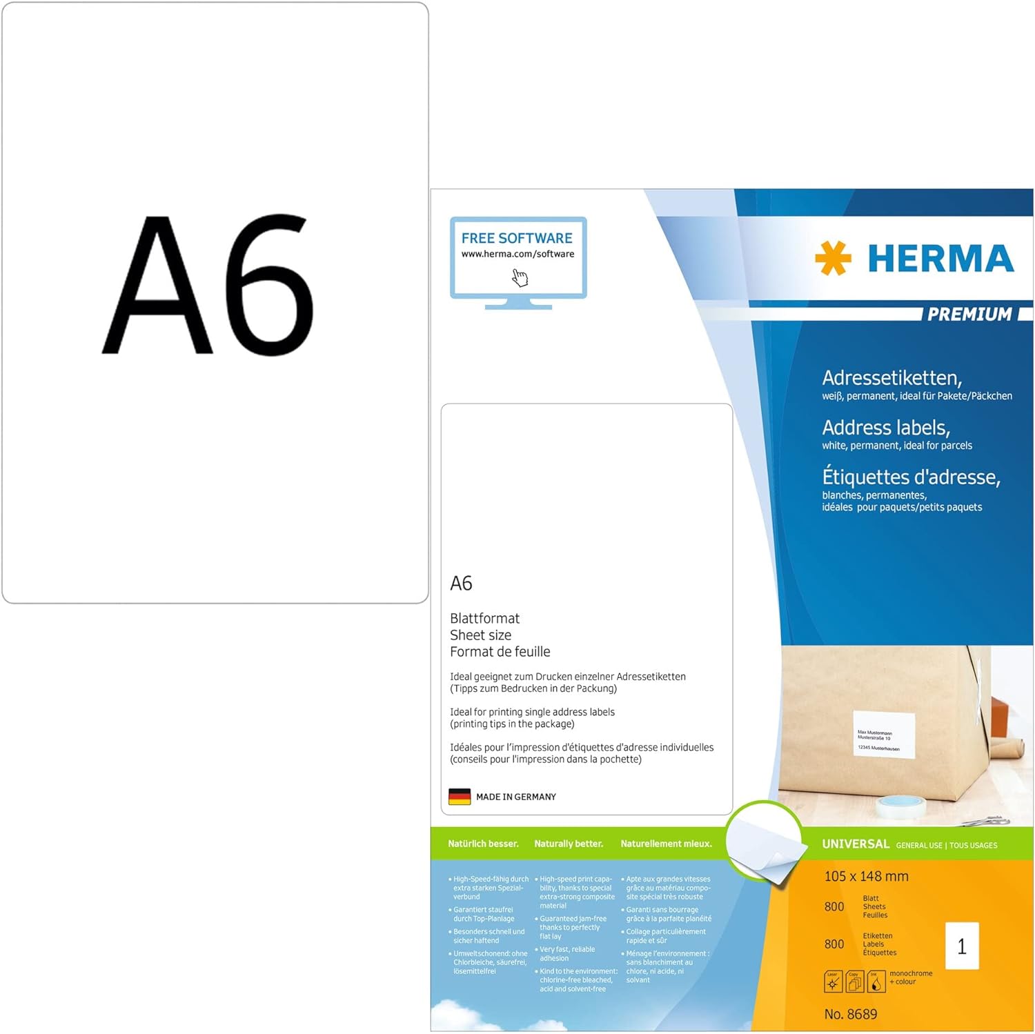 • Lieferumfang: 800 x HERMA PREMIUM Adressetiketten, DIN A6 Format, 10,5 x 14,8 cm, rechteckig, weiss (800 Blatt je 1 Etikett)