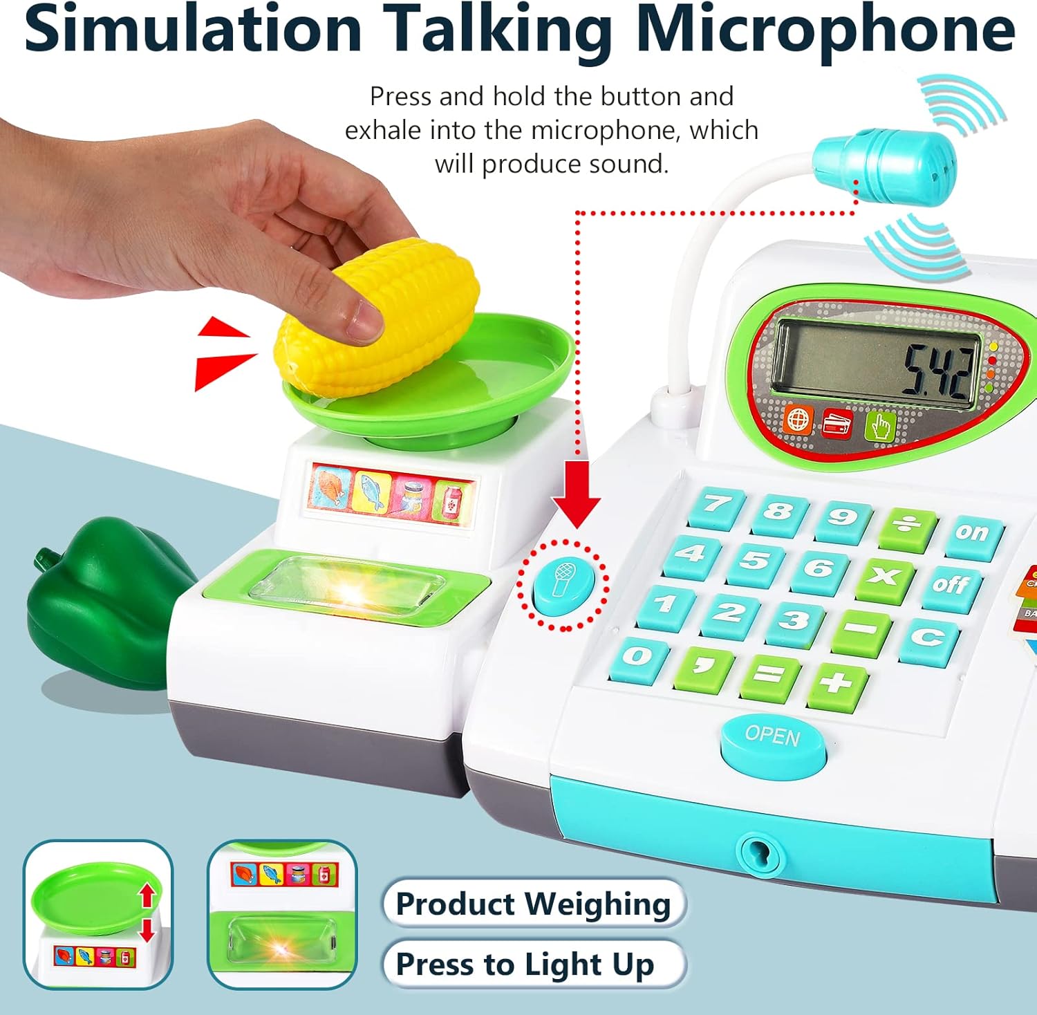 • 【 Spielkasse mit Mikrofon 】 Halten Sie die Mikrofon-Taste gedrückt und atmen Sie in das Mikrofon aus, das Mikrofon wird Ton emittieren.