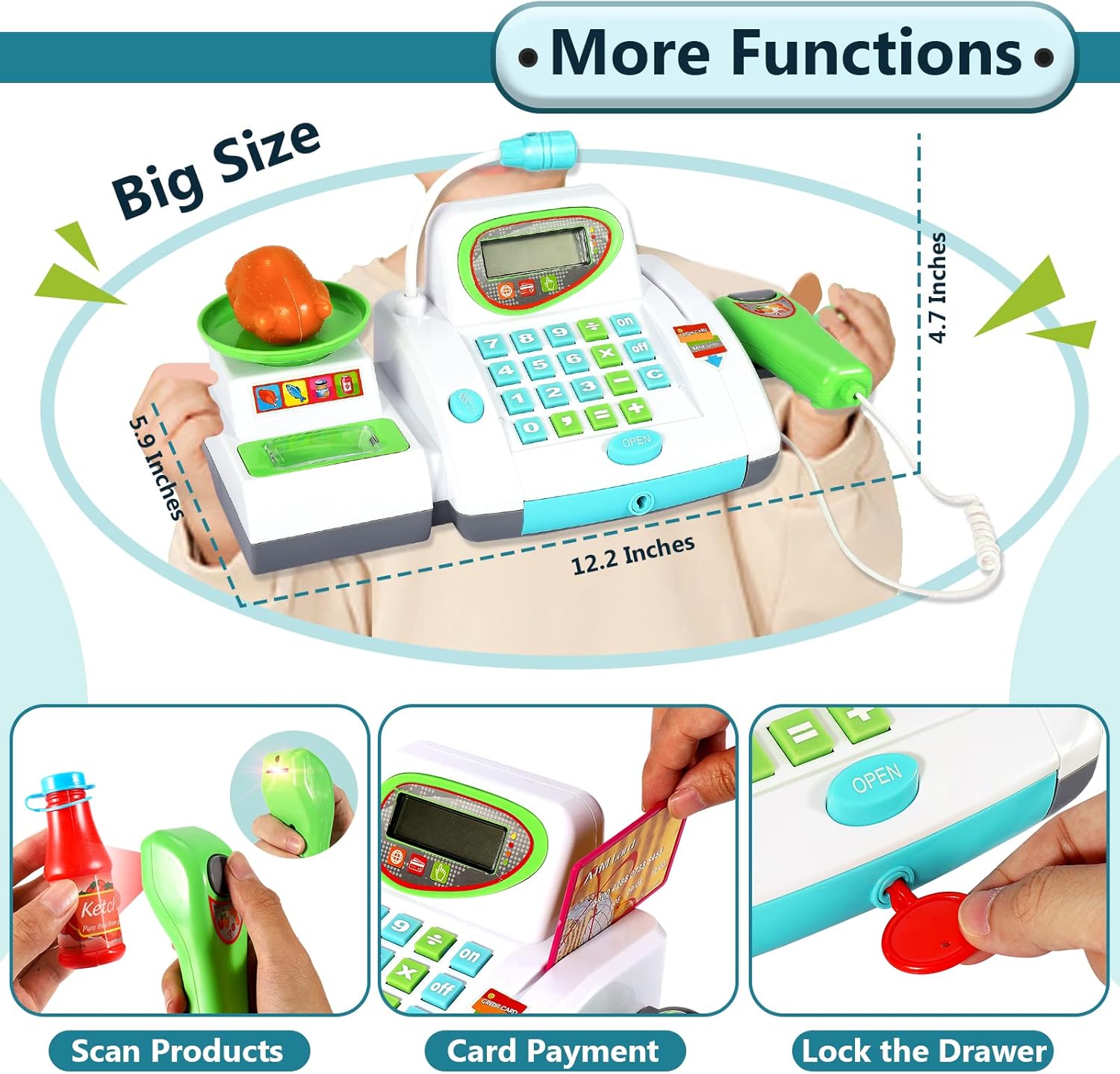 • 【Kinderkasse mit Scanner und Sound】: Scannen Sie Gegenstände mit dem Scanner, der Scanner gibt ein rotes Licht und tropfendes Geräusch wie ein echter Scanner aus.