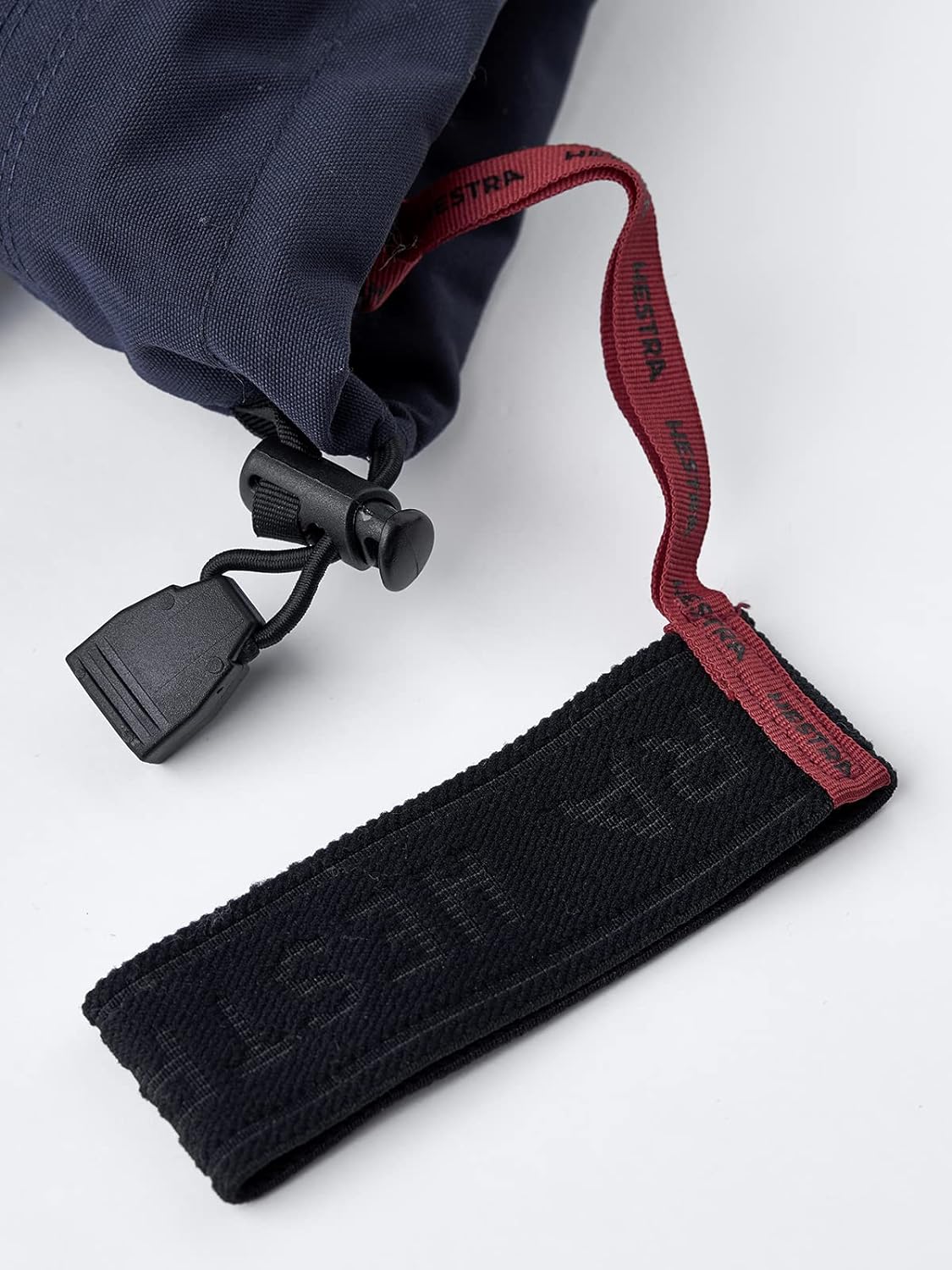 - Schneeschlüssiges Band mit Klettverschluss und Hestra-Hand-Manschetten, um die Handschuhe am Handgelenk zu befestigen.