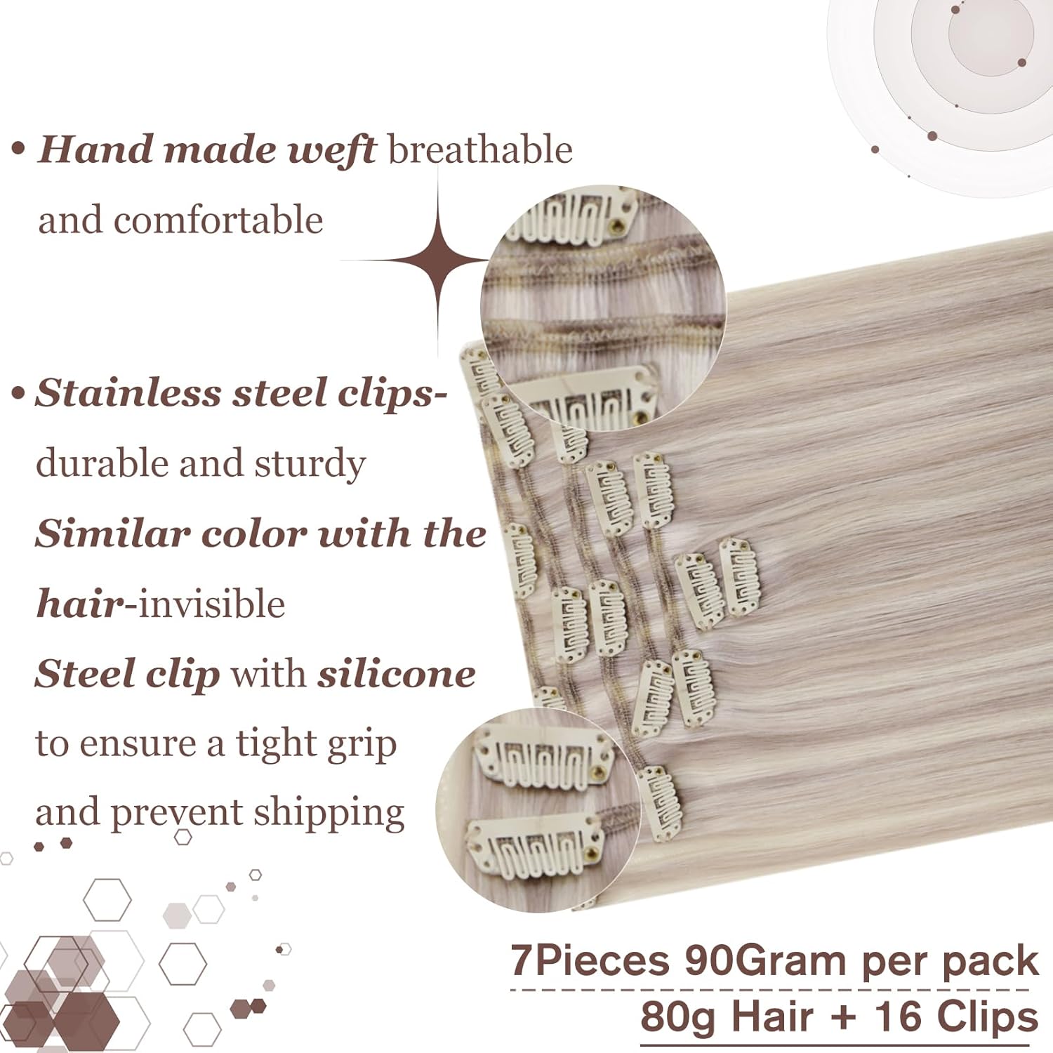 - 【Spezifikation von Hetto Clip in Hair Extensions】 Clip-Haarverlängerungen sind 7 Stück mit 16 Clips: 12 Zoll ist 80 Gramm Nettogewicht für Haare mit 20 g Clips; 14-22 Zoll ist 100 Gramm Nettogewicht für Haare mit 20 g Clips. Der Clip besteht aus