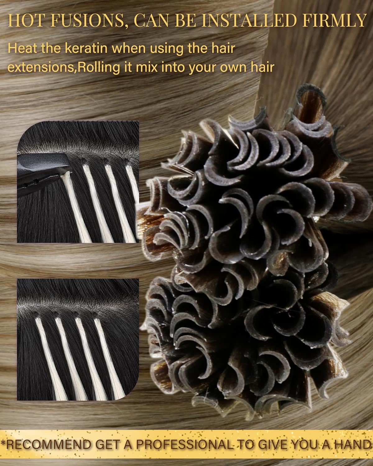 - ▲ Wir empfehlen Ihnen, in den Friseursalon zu gehen, um einen professionellen Friseur zu finden, der Ihnen bei der Installation von HETTO Utip Haarverlängerungen hilft, da unsachgemässe Tragemethoden die Lebensdauer verkürzen.