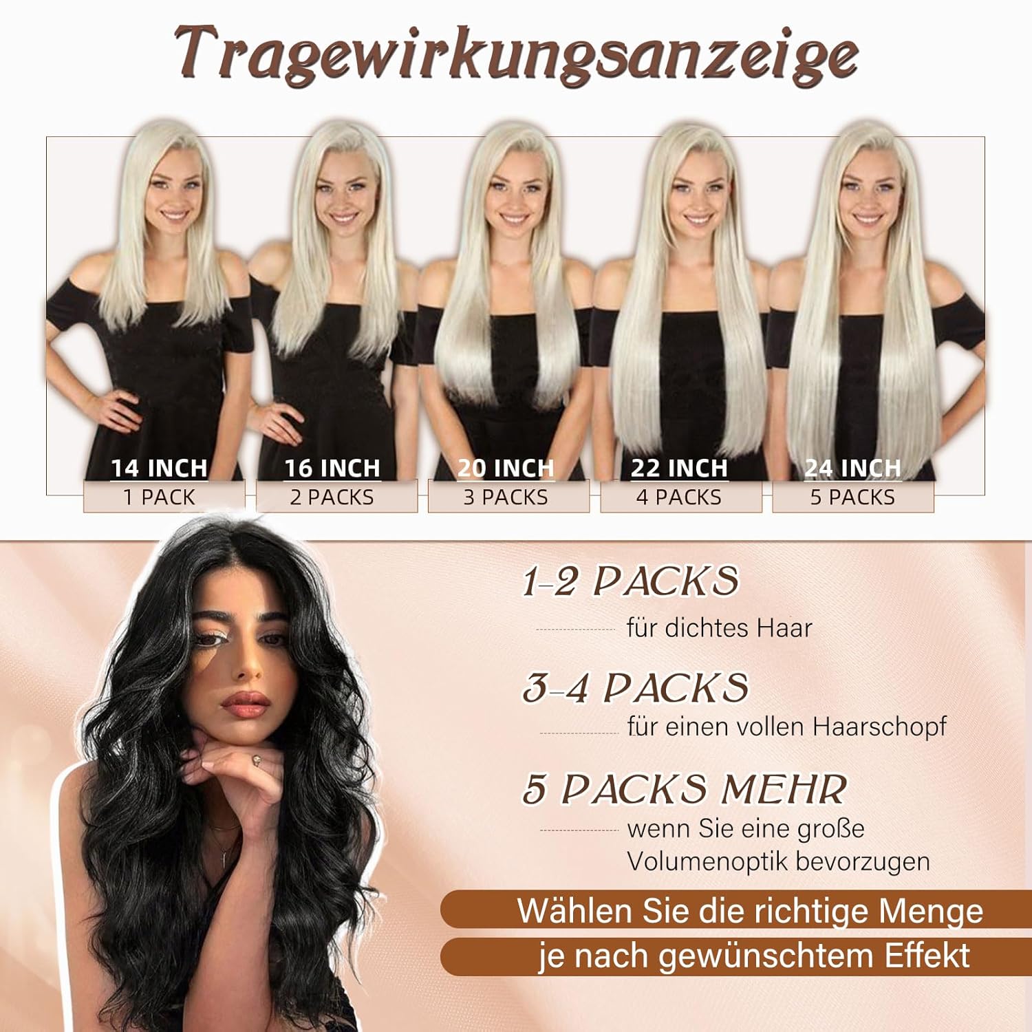 • ♬Spezifikationen: Die Länge beträgt 12-22 Zoll. Einfarbig 12/14 Zoll-40 g, 16-22 Zoll-50 g. Hervorhebungsfarbe 12 Zoll-40 g 14-22 Zoll-50 g. Jede Packung enthält 20 Tabletten. 2-3 Packungen für einen vollen Kopf.