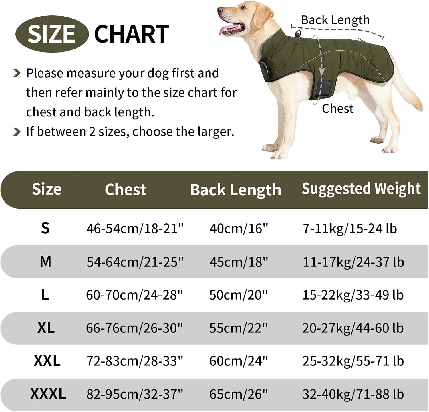 - 6 Grössen mit Messanleitung: Die wasserdichte Hundejacke ist in 6 Grössen von S bis XXXL erhältlich und eignet sich für kleine, mittelgrosse und grosse Hunde. Bitte messen Sie den Brustumfang und die Rückenlänge Ihres Hundes, bevor Sie die