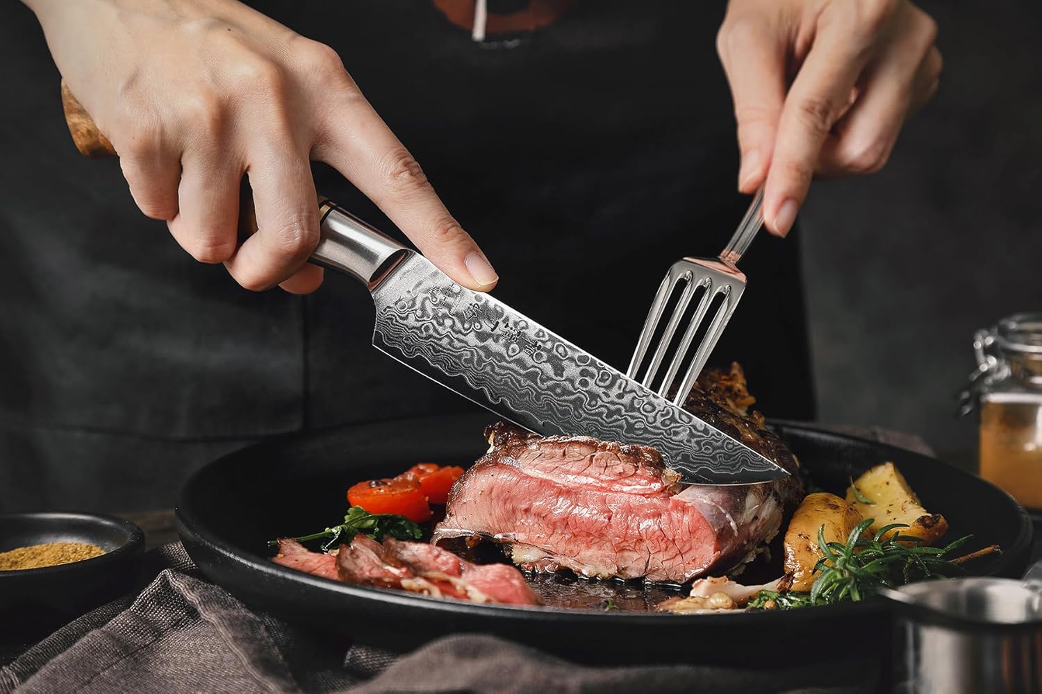 - [Superscharfe Klinge] Hergestellt aus 67 Lagen Damaststahl, richtig plastifiziert, komprimiert und wärmebehandelt, um die Dicke zu verbessern, den 10Cr15CoMoV-Kernstahl zu schützen und die Schärfe zu verbessern. Aufgrund des Kantenwinkels von 15 °