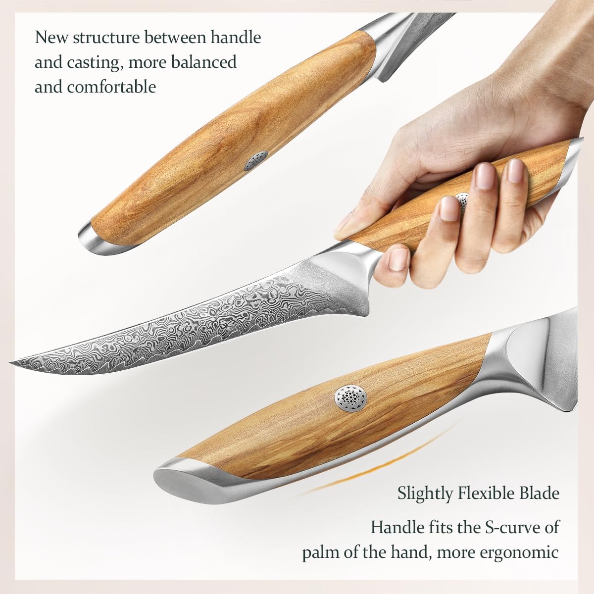 - [Olivenholz Griff] Als edle Art in Europa, Olivenholz hat eine hohe Dichte und Härte, helle Farbe und schöne Textur. Nach dem Polieren von Hand fühlt es sich sehr angenehm an und ist eine Kombination aus Schönheit und Zweckmässigkeit. Die