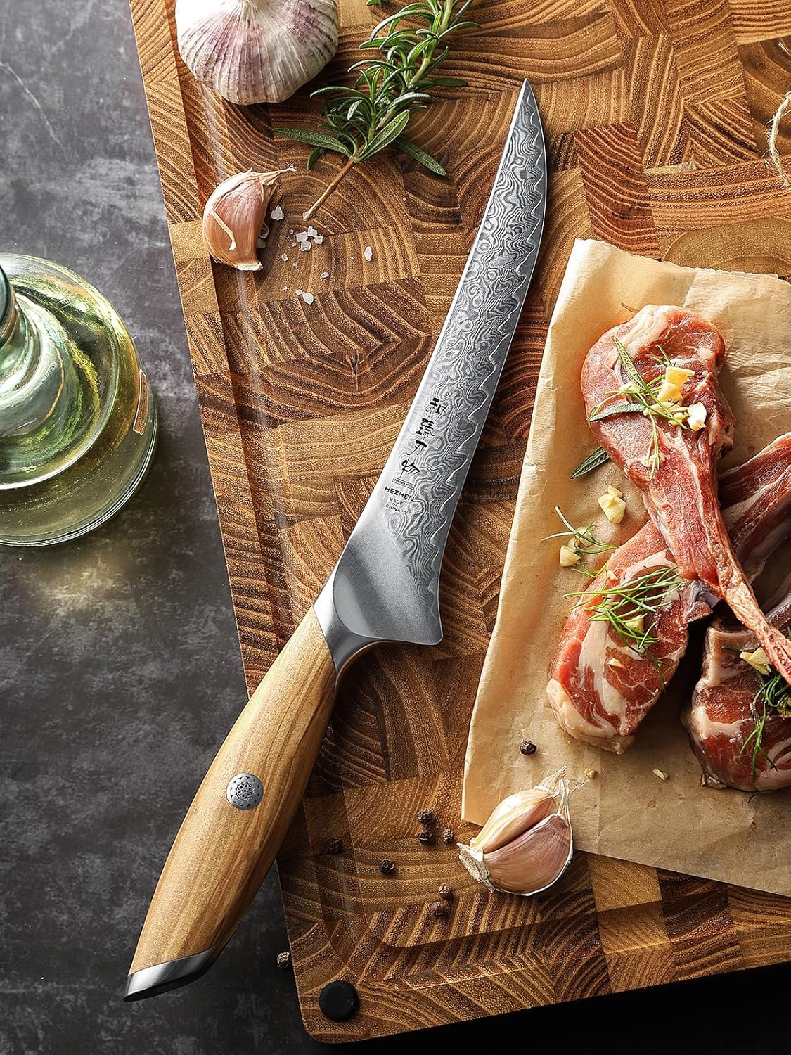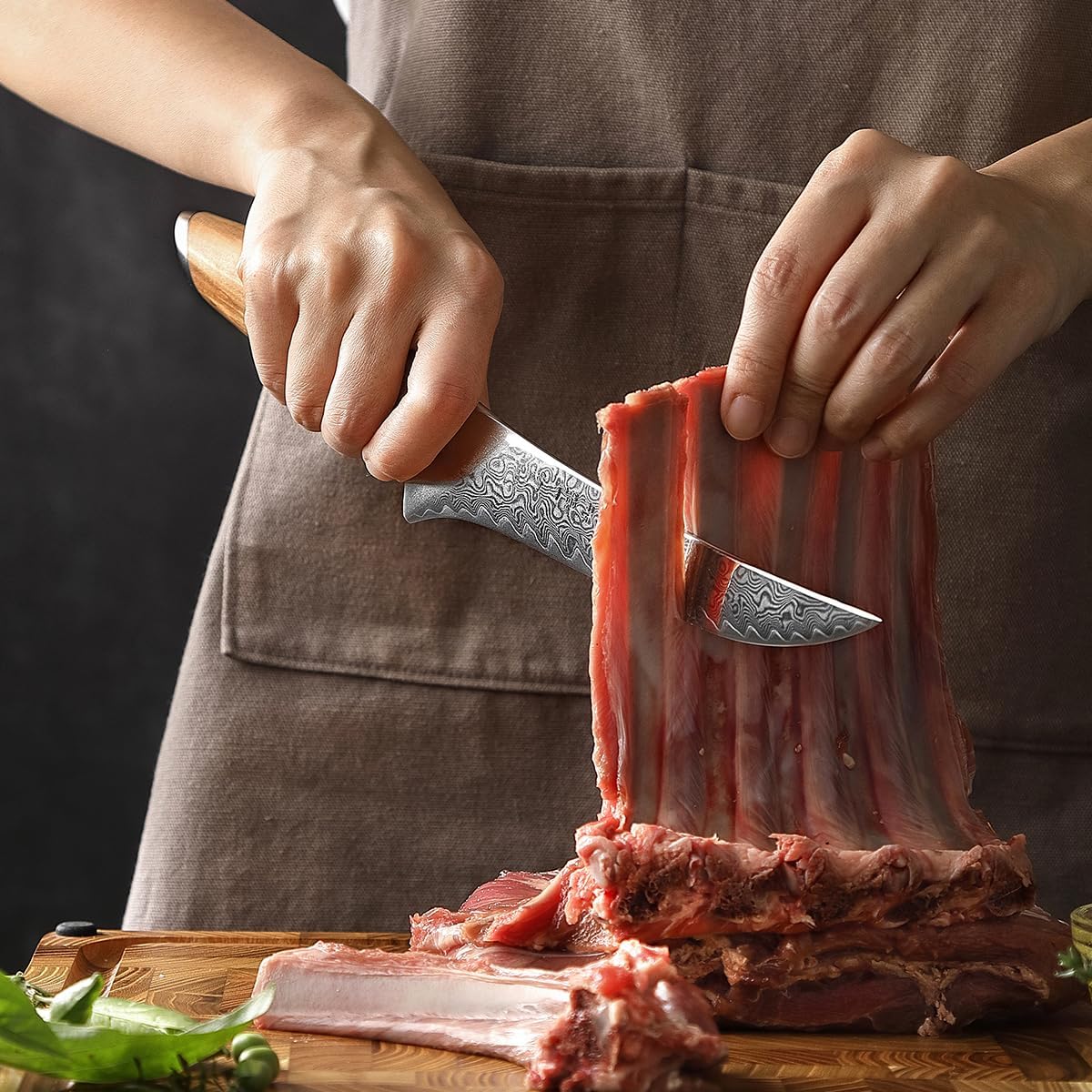 - [Langlebige&Ultra-scharfe Klinge] Die Klinge ist aus 73 Lagen echtem Damaszener-Schmiedestahl gefertigt, nicht aus Laser. Die Klinge hat einen Winkel von 15°±1 pro Seite, um ein besseres Gleichgewicht zwischen Schärfe und Haltbarkeit zu erreichen, und