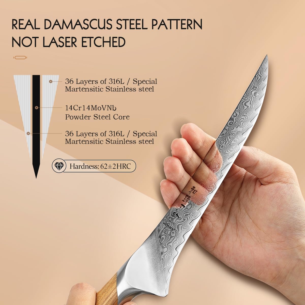 - [Ausgewählter 73 Lagen Damaststahl Pulverstahl] Wir wählen einen 14Cr14MoVNb Stahlkern, der nach einer Vakuum-Tiefkühl-Wärmebehandlung eine stabile Rockwell-Härte von 62±2HRC aufweist, die eine lang anhaltende Schärfe und grössere Zähigkeit